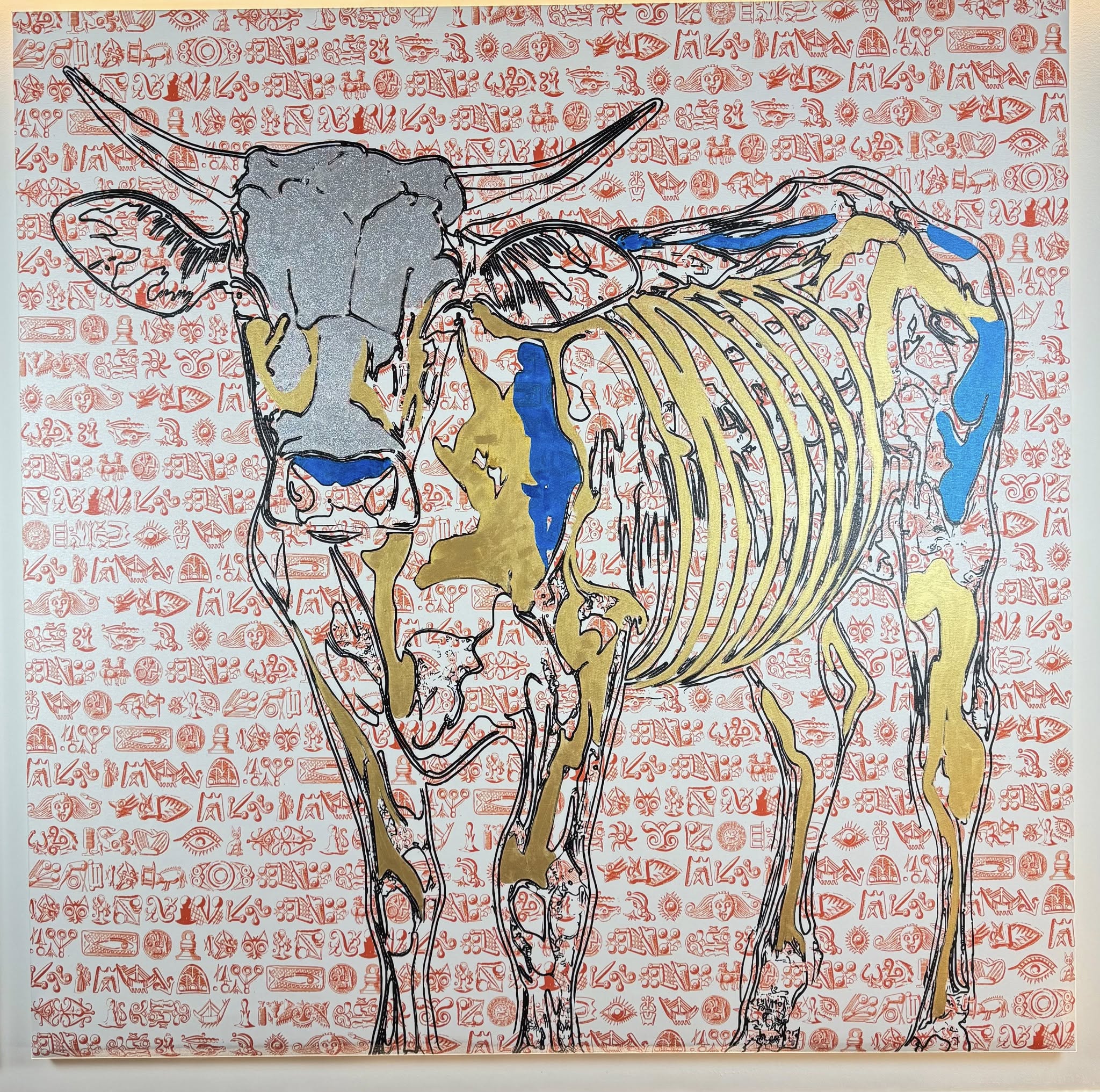 Η σκελετωμένη αγελάδα, με τα πλευρά της εκτεθειμένα σαν επιχρυσωμένα κάγκελα φυλακής, με ελάχιστες κηλίδες γαλάζιου και μπλε χρώματος πάνω της να τονίζουν την αντίθεση ανάμεσα στη βασιλικότητα και τη φθορά, δεν λιώνει όπως ο πιγκουίνος, αλλά απογυμνώνεται σαν να πρόκειται να διαμελιστεί. Στην αγελάδα, ο Μάνος Ιωαννίδης αποτυπώνει την ανατομία της εκμετάλλευσης. Ένα παραδοσιακό σύμβολο μητρότητας, εργασίας, αφθονίας και αφιλοκερδούς προσφοράς αγαθών απισχναίνεται από την εμπορευματοποιημένη υπερκαταναλωτικότητα της εποχής που έχει χάσει κάθε μέτρο ισορροπίας με τη φύση. Στην μεταμόρφωση της Ιούς από την Ήρα σε αγελάδα για να τιμωρήσει την απιστία του Δία, στο σώμα της υπήρχαν τρία χρώματα, λευκό ρόδινο και μαύρο, λέει ο μύθος. Καθόλου τυχαία, ο Μάνος, χρησιμοποιώντας το γκρι στο κεφάλι, το χρυσό στο σκελετό και το γαλάζιο σποραδικά στο σώμα, απομακρύνεται από τον αρχαίο συμβολισμό της Ιούς ως σελήνη και δημιουργεί ένα νέο μυητικό σύμβολο στην βασικότερη παθογένεια της εποχής μας: την απώλεια της αφθονίας ως αποτέλεσμα της υπερ-εκμετάλλευσης της φύσης. Και αυτό είναι η συμπτωματική αλλά επίκαιρη εικονοποίηση της σκέψης του Dipesh Chakrabarty (2009, 197-222) ότι το Ανθρωπόκαινο καταρρίπτει τα όρια μεταξύ φύσης και ιστορίας. Επιπλέον, τα ιδεογράμματα της Γραμμικής Α σαν σταθερό φόντο του έργου, γίνεται ένα εικαστικό ημερολόγιο της πλανητικής εξάντλησης, γραμμένο σε μια γλώσσα που λίγοι θα αποκρυπτογραφήσουν ποτέ.