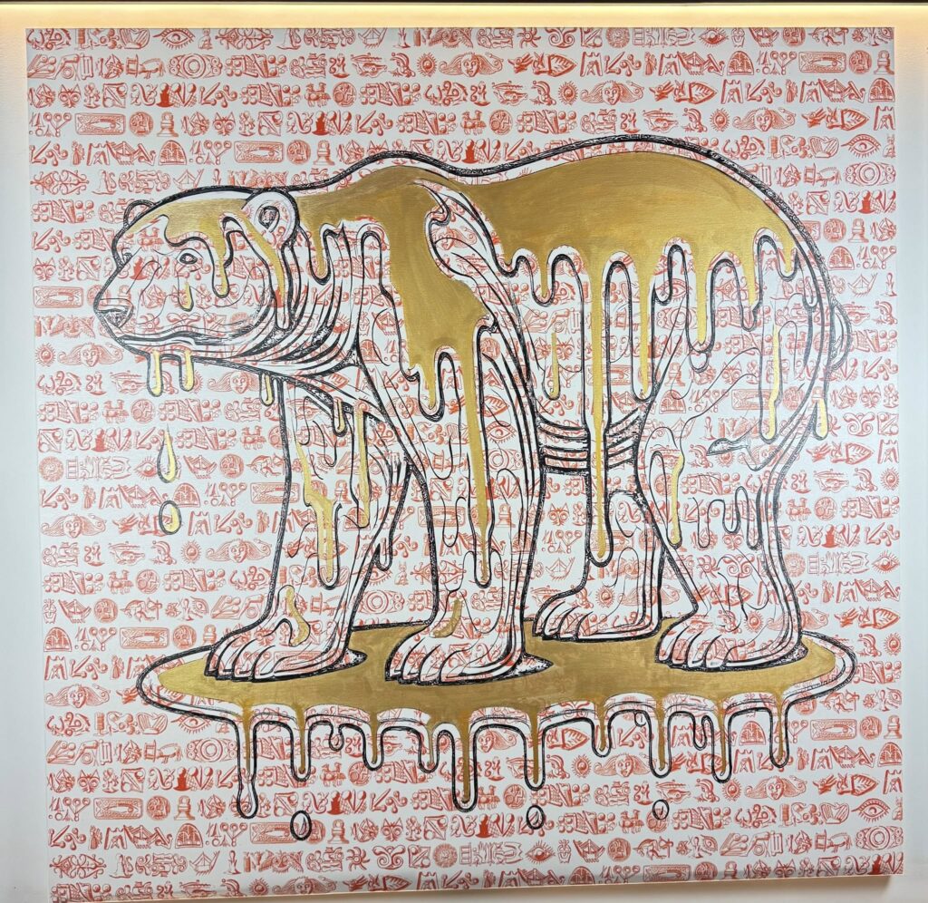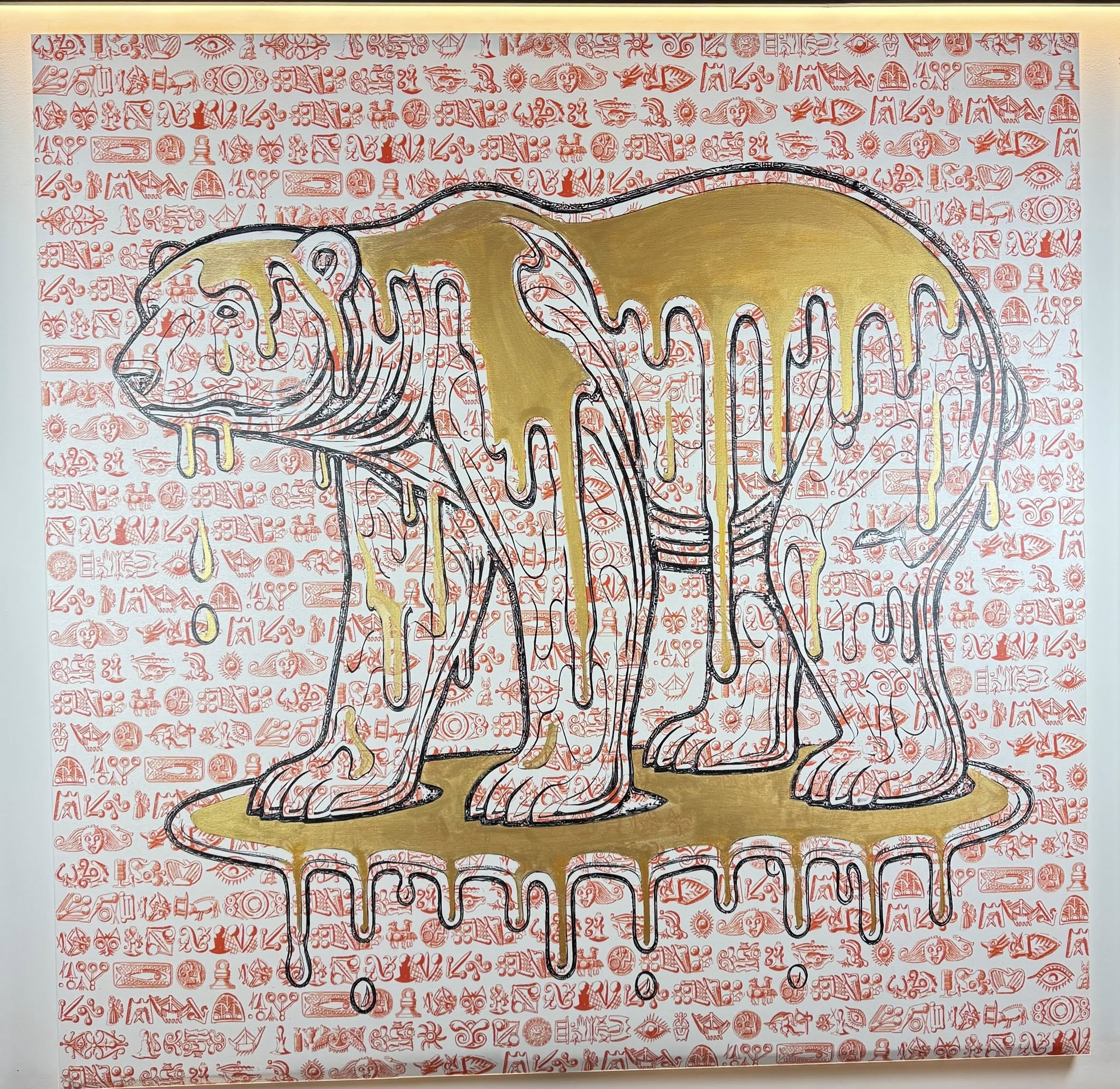 Η Πολική Αρκούδα συμπληρώνει το τρίπτυχο της κλιματικής αλλαγής. Η επιλογή του χρυσού που στάζει πάνω από το σώμα της γίνεται ένα καυστικό σχόλιο για τον χρυσό που χύνεται σαν τοξική κηλίδα, μια ειρωνεία της ανθρώπινης απληστίας. Αν και η πολική αρκούδα είναι το πιο εμβληματικό ζώο όταν αναφερόμαστε στο λιώσιμο των πάγων και την υπερθέρμανση του πλανήτη, ο Μάνος αποφεύγει το στερεότυπο και αφαιρώντας το πλαίσιο, εστιάζει αποκλειστικά στη μορφή και τη ροή. Η αρκούδα αναδιαμορφώνεται όχι ως ένα επόμενο θύμα, αλλά ως μια τραγική μεγαλειώδης μορφή που υφίσταται οντολογικό μετασχηματισμό (Latour, 2017). Γιατί η αρκούδα, δεν πεθαίνει απλώς, αλλά γίνεται κάτι άλλο: από ζώο μεταμορφώνεται σε έμβλημα της συστημικής κατάρρευσης.