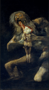 Ο Κρόνος που καταβροχθίζει το παιδί του δεν είναι μια μυθολογική αφήγηση αλλά μια εικόνα ακραίας υπαρξιακής βίας. Ο θεός δεν εμφανίζεται ως κοσμική αρχή αλλά η προσωποποίηση της αγωνίας του χρόνου, του φόβου απώλειας, της αυτοκαταστροφικής διάσταση της εξουσίας. Το τέρας δεν βρίσκεται πλέον έξω από τον άνθρωπο αλλά κατοικεί μέσα του.Η μεταγενέστερη αποκόλληση των τοιχογραφιών από τους τοίχους και η μεταφορά τους σε καμβά, με σοβαρές απώλειες υλικού, εντείνει συμβολικά αυτή τη ρήξη: το έργο που γεννήθηκε ως ιδιωτική ψυχική επιφάνεια εντάχθηκε τελικά στους χώρους του μουσείου Prado. Ωστόσο, η εκφραστική του δύναμη επηρέασε καθοριστικά τον Εξπρεσιονισμό και τον Σουρεαλισμό, όπου η τέχνη αναζητά πλέον όχι τη θεία τάξη αλλά το βάθος της ανθρώπινης συνείδησης.