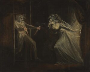 Εμπνευσμένος από τον Όμηρο, τον Δάντη, τον Σαίξπηρ και τον Μίλτωνα, ο Fuseli αντί να εικονογραφήσει τη λογοτεχνία, σκηνοθέτησε το άλογο, το φαντασιακό και το ασυνείδητο. Η ενασχόληση του με τον Σαίξπηρ, και ιδιαίτερα με τον Μάκβεθ, αποκαλύπτει ότι ο Fuseli αντιλαμβάνεται τη λογοτεχνία ως ψυχικό θέατρο. Οι μορφές του δεν είναι ήρωες αλλά εκρήξεις εσωτερικών παρορμήσεων. Στη σκηνή όπου η Λαίδη Μάκβεθ αρπάζει τα ματωμένα στιλέτα από τον παραπαίοντα σύζυγό της, (Πράξη ΙΙ σκηνή 2), ο ζωγράφος αποδίδει τη στιγμή της εσωτερικής κατάρρευσης. Ο Μάκβεθ εμφανίζεται ως παραληρηματική μορφή, διαλυμένη από ενοχή και τρόμο.Όπως είχε δηλώσει ο ίδιος, «όλες οι λεπτομέρειες καταστρέφουν τον τρόμο», υπογραμμίζοντας ότι ο στόχος του δεν ήταν η ρεαλιστική ακρίβεια αλλά η ψυχολογική ένταση (Fowle 2000). Έτσι, το φαντασιακό του Fuseli αποκαλύπτεται ως εμπειρία τρόμου.