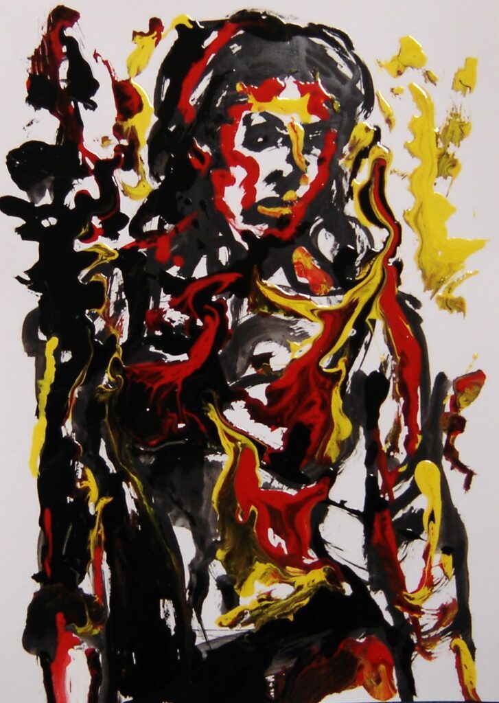 Periklis Costopoulos paints conflict. Intense gestures and extreme chromatic contrasts—anchored in an obsessive trichromy of black/red/yellow—spill onto the whiteness of the canvas to render the female figure as an event: the very moment an image is born and, at the same time, threatened by the forces that bring it into being. It is no coincidence that he titles this logic Situations in the Human Dimension: form does not operate as a static subject but as a field in which moments, tensions, and shifts condense.
