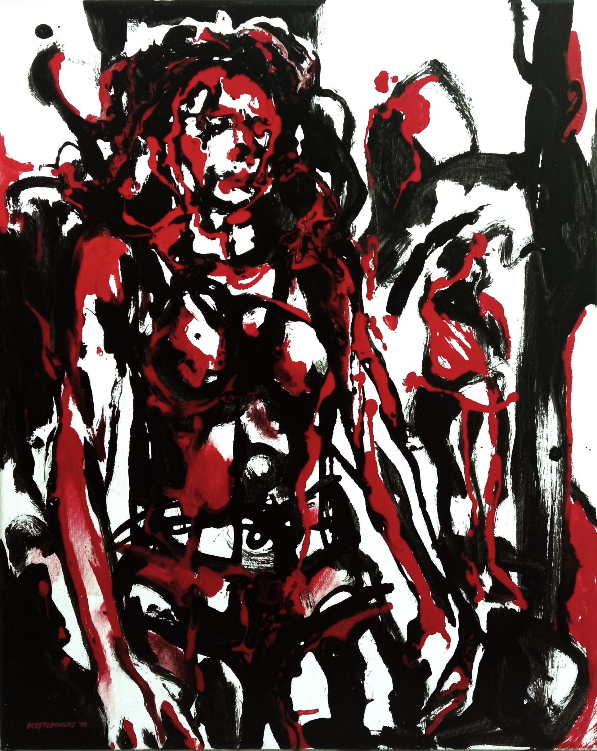 Η εμμονή στην τριχρωμία, η άρνηση του περιγραφικού βάθους, η βαρύτητα των σταξιμάτων μετατρέπουν το σώμα σε επιφάνεια εγγραφής, έναν χώρο όπου η μορφή διαβρώνεται και ανασυντίθεται. Σ’ αυτή την «καταστασιακή» λογική του Κωστόπουλου, οι συνθήκες γεννούν τη μορφή. Έτσι, η ζωγραφική του εντάσσεται στις μετα-νεωτερικές εκδοχές της νέο-παραστατικότητας και της νέο-εξπρεσιονιστικής ζωγραφικής, όπου η μορφή διατηρεί τα χαρακτηριστικά της αλλά χάνει την ταυτότητά της. Το βλέμμα του θεατή αιωρείται ανάμεσα στην ταυτόχρονη έλξη και απώθηση, τη φρίκη και τη γοητεία (jouissance αλά Kristeva), μπροστά σε κάτι που γοητεύει ακριβώς επειδή απειλεί να διαλύσει την ασφάλεια της βεβαιότητας. Από αυτή την οπτική, η ζωγραφική του Κωστόπουλου θέτει ενίοτε το γυναικείο σώμα στην κρίση του θεατή, δείχνοντας με τις ζωγραφιές του τι μπορεί να παραμείνει ορατό και τι μπορεί να απορριφθεί σαν απόβλητο.
