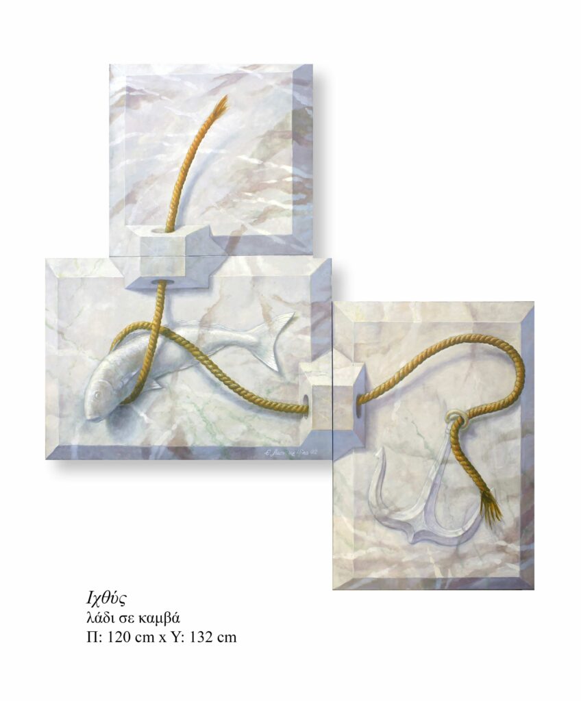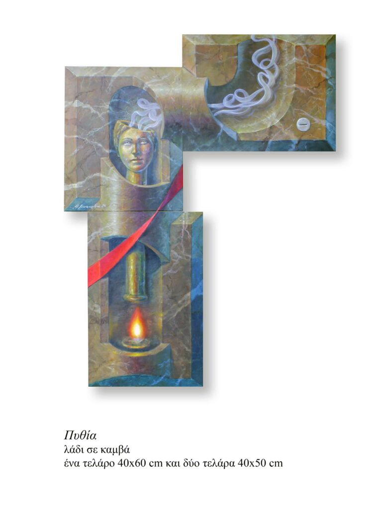 This overall vision, combining invention with volumetric illusion, narrative, and geometric structure, leads to what he himself calls Virtual Volumism: an imaginary volumism in which volume is born from sustained attention to the image, and the image acquires spatial substance without losing its figurative character. In this system, painting does not remain flat. It becomes an active space, a visual mechanism that extends beyond the limits of the stretcher and enters into dialogue with the material space of the real world. (https://www.periou.gr/giannis-kolokotronis-o-doureios-ippos-tis-logikis-tou-thanasi-leontaridi/)