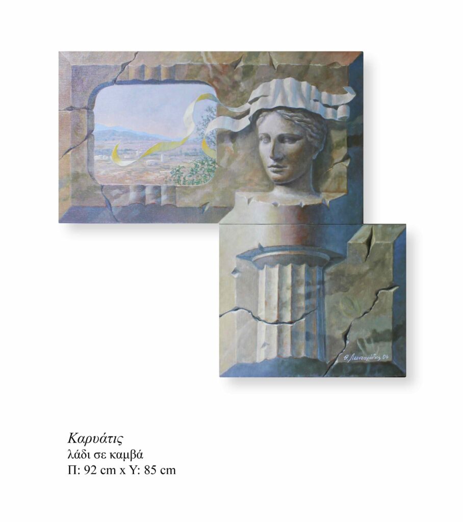 Thanasis Leontaridis has forged a recognizable visual language: a hybrid of surrealism, pictorial storytelling, and the architectural construction of the canvas itself. His works resemble visual puzzles. They possess a three-dimensional, almost theatrical presence: grounded in realism yet interrupted by symbolic forms, rendered in pure colors (blues, brick reds, ochres, blue-greens) and marble-like textures. The fundamental principle running through his work is that the canvas is not a limitation, but part of the narrative.