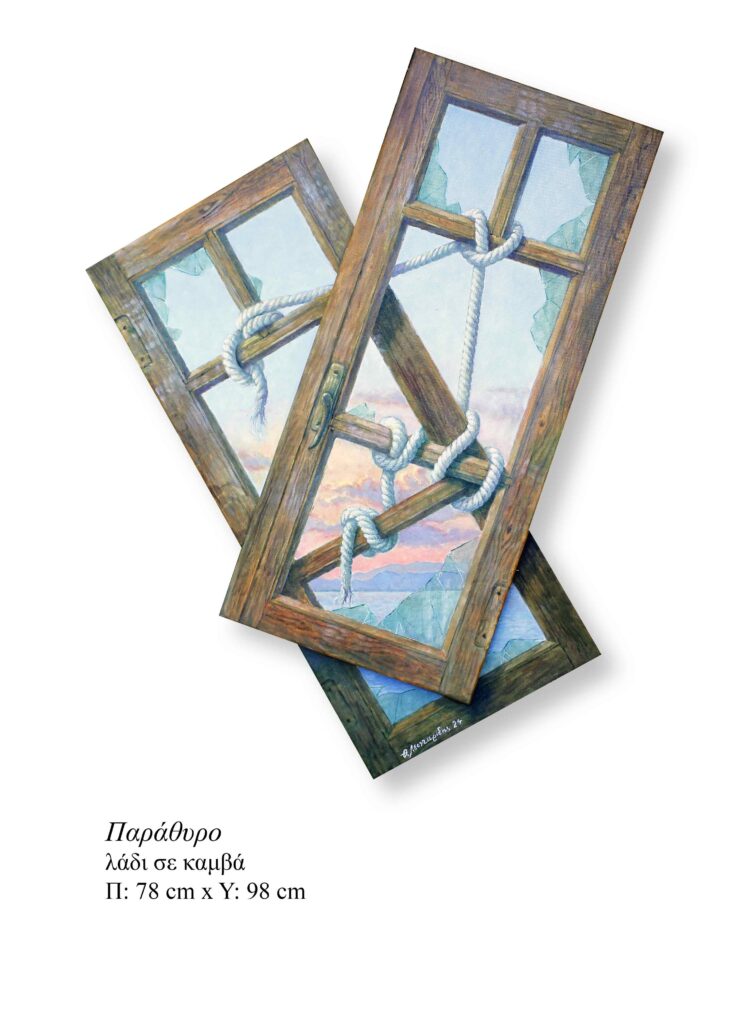 Equally characteristic is Leontaridis’ playful, yet strictly geometric, fixation on openings (window, aperture, porthole). These are threshold points—passages between worlds, places, and landscapes—where the viewer shifts position: sometimes as an observer, sometimes as a mental participant solving riddles, and sometimes as an intermediary between fantasy and illusion.
