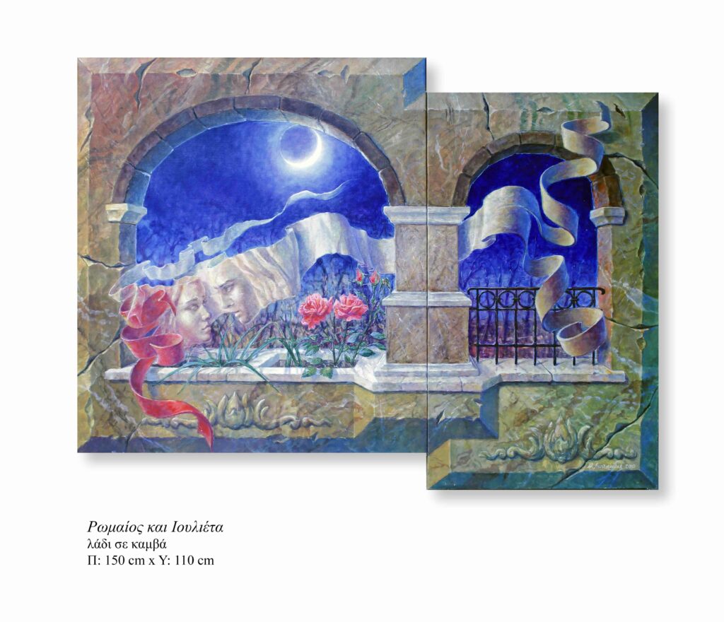 Wherever the human figure appears, it is incorporated into a system of symbols, as though it belonged to a larger iconographic machine. In The Turn, the small figures resemble ants, underscoring the scale of the space and the dominance of geometric architectural elements. In Romeo and Juliet, the faces—like fossilized masks—belong to the memory of the myth. In The Prophecy of the Fall, embedded in masonry like faces carved into rock, they become allegories, while the white floating forms serve as prefigurations of a suspended future.