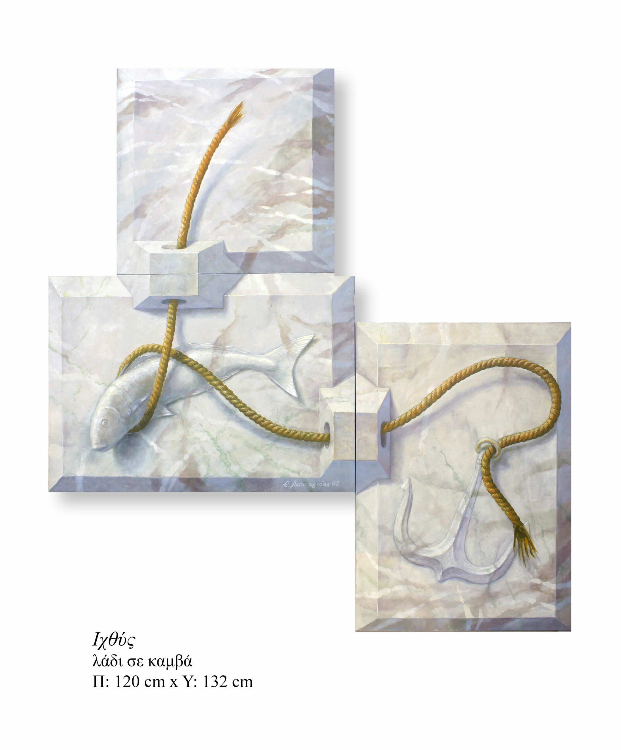 Thanasis Leontaridis has forged a recognizable visual language: a hybrid of surrealism, pictorial storytelling, and the architectural construction of the canvas itself. His works resemble visual puzzles. They possess a three-dimensional, almost theatrical presence: grounded in realism yet interrupted by symbolic forms, rendered in pure colors (blues, brick reds, ochres, blue-greens) and marble-like textures. The fundamental principle running through his work is that the canvas is not a limitation, but part of the narrative.