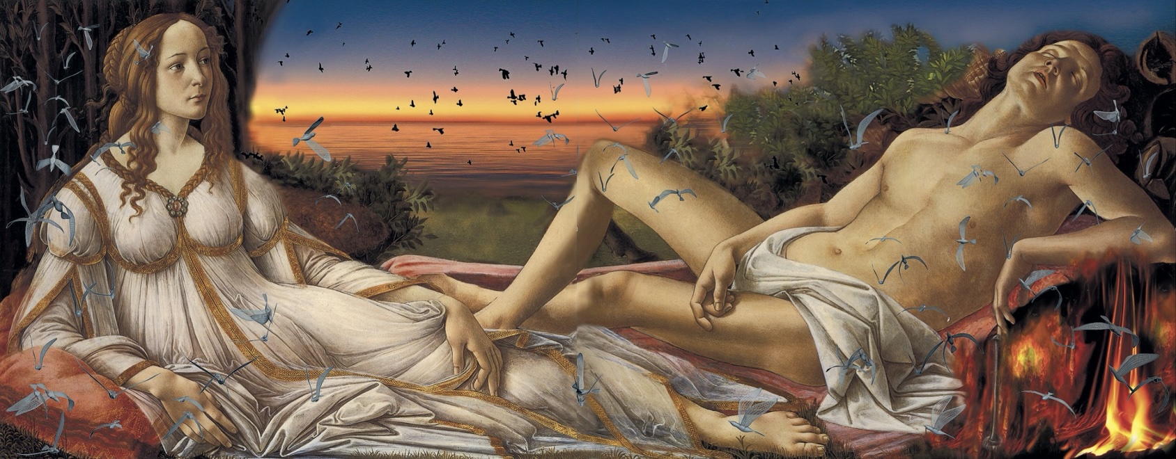 Η αναγεννησιακή βεβαιότητα που θέλει έναν κόσμο ιεραρχημένο και κατανοητό, συμβολικό και ευανάγνωστο, με συμμετρία, τάξη και ομορφιά χάνεται, και μέσω της ψηφιακής και ζωγραφικής επέμβασης της Χατζησάββα, βασικά στοιχεία του αρχικού έργου αντικαθίστανται με νέα εικονογραφικά σημεία: οι σάτυροι, η λόγχη, η πανοπλία και το κράνος εξαφανίζονται. το φως της ημέρας μετατρέπεται σε ένα πυρακτωμένο ηλιοβασίλεμα. το λιβάδι γίνεται θάλασσα. μαύρα και γαλάζια πτηνά γεμίζουν τον ουρανό. η φωτιά στο πλάι του κοιμισμένου Άρη αντικαθιστά τον μικρό σάτυρο, μετασχηματίζοντας τη σκηνή σε τόπο απομυθοποίησης και στοχασμού.