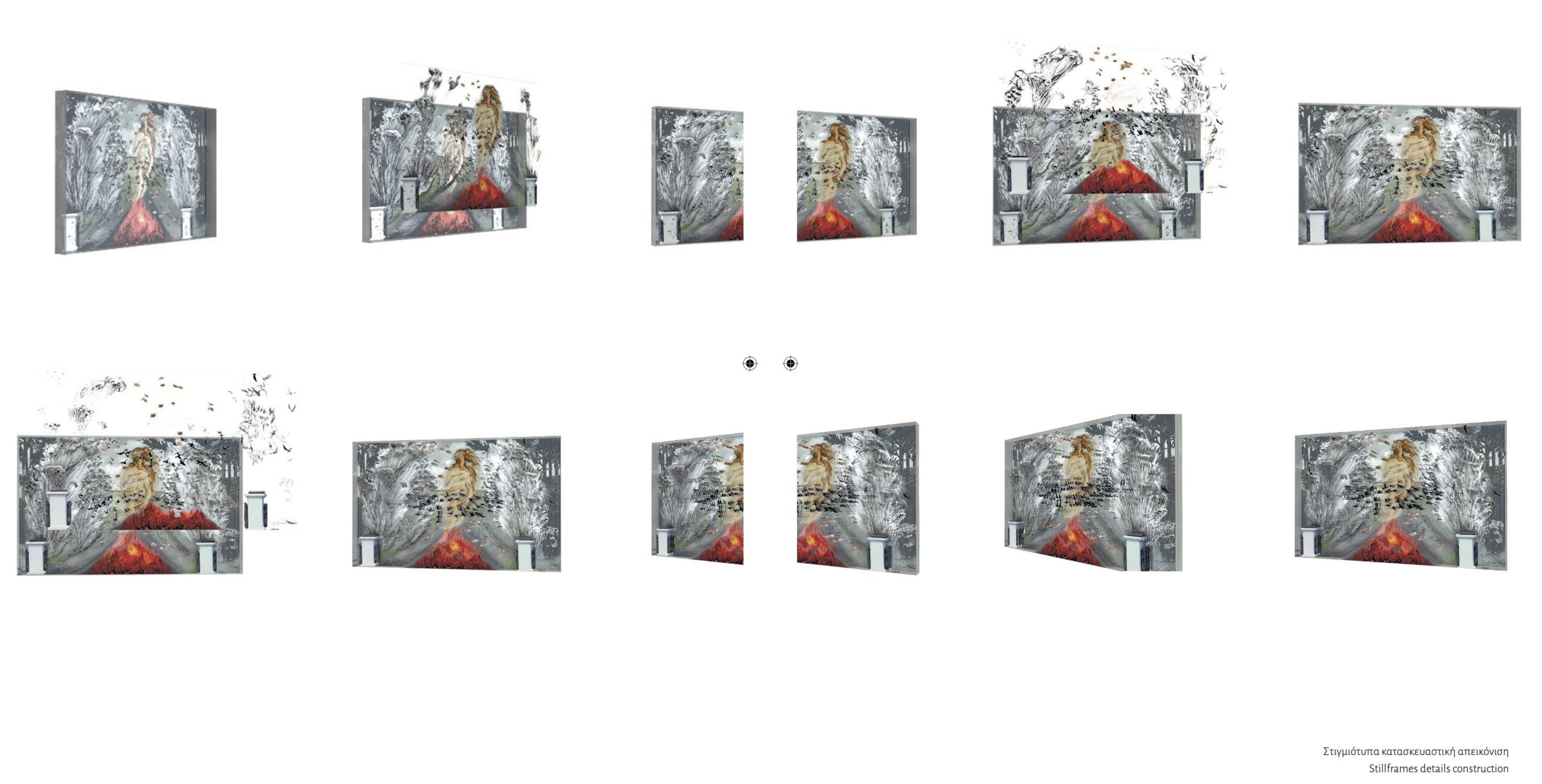 Ξεκινώντας από το έργο του Botticelli ως υπόστρωμα, η Χατζησάββα παρεμβαίνει με αλλεπάλληλες χειρονομίες σε διαφανή επίπεδα πλεξιγκλάς, δομώντας ένα ενιαίο οπτικό πεδίο, το οποίο σταδιακά εξελίσσεται σε παλίμψηστο εικόνων, χρόνου και θεωρίας. Η μέθοδος της ακολουθεί τη λογική του πολυστρωματικού αρχείου: κάθε διαφανές επίπεδο (σε μορφή πλεξιγκλάς) παρεμβαίνει διακριτικά πάνω στην αρχική αναγεννησιακή εικόνα, με λεπτές χειρονομίες που διαβρώνουν σταδιακά το ερμηνευτικό της περιεχόμενο. Το τελικό αποτέλεσμα χάνει την ασφάλεια της παραδοσιακής ιστοριογραφικής ανάγνωσης και αποκτά ένα νέο, δυναμικό οπτικό περιεχόμενο, το οποίο ενσωματώνει τον χρόνο, την κίνηση του θεατή και τη μεταβαλλόμενη εστίαση του βλέμματος στην εικόνα. Καθώς η σύνθεση διαλύεται σε αποσπασματικά στιγμιότυπα απεικόνισης (stillframes), το αναγεννησιακό αφηγηματικό πλαίσιο αποδομείται και μετασχηματίζεται.