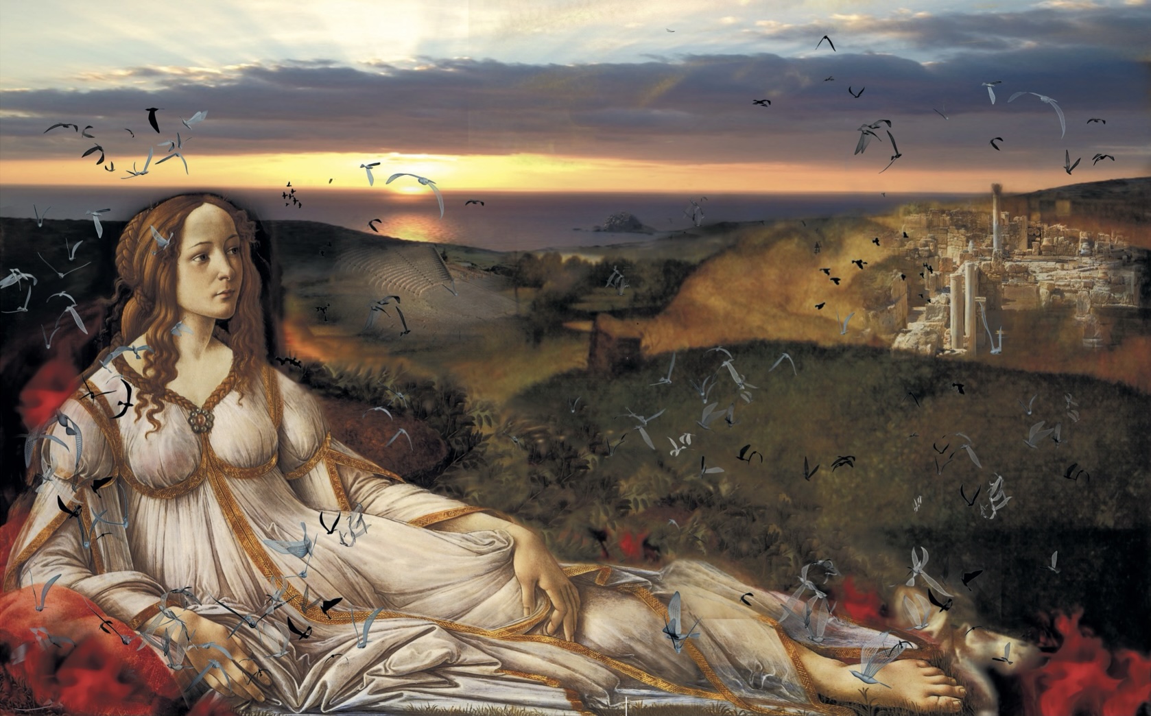 Στα έργα Ηλιοβασίλεμα στην Πάφο και Η Αφροδίτη στο Κούριο, από την ενότητα με τίτλο «Επαναπατρισμός της Θεάς» (Γκαλερί Καπάταη, Λευκωσία 2020), η Ερατώ Χατζησάββα επιχειρεί μια μετασχηματιστική σπουδή στο γνωστό έργο του Sandro Botticelli, Αφροδίτη και Άρης (1485, αυγοτέμπερα και λάδι σε μάλλινο ύφασμα 69.2×173.4 εκ. The National Gallery, Λονδίνο).