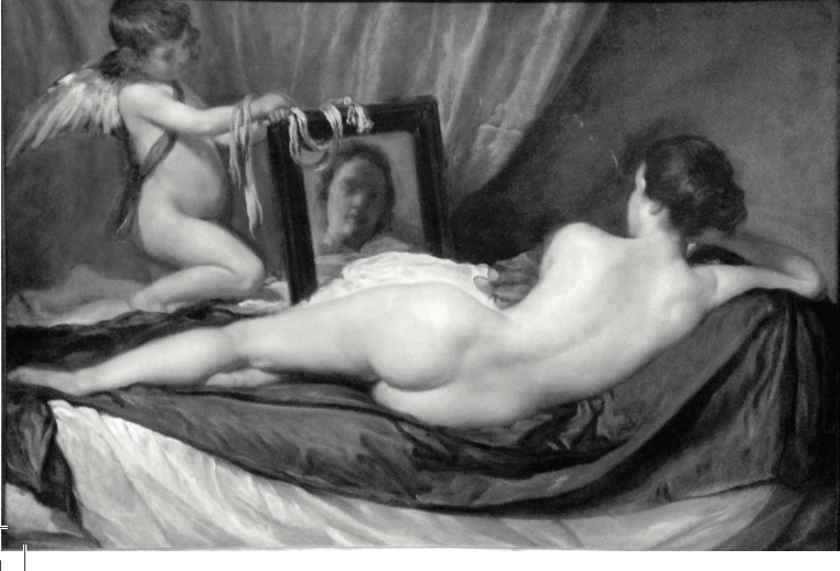 Στο διάσημο έργο του Diego Velázquez (περί το 1647–51), Η Τουαλέτα της Αφροδίτης ή Η Αφροδίτη του Rokeby (1647-51, λάδι σε μουσαμά 122.5×177 εκ. The National Gallery, Λονδίνο), το γυναικείο σώμα εκτίθεται σαν αισθησιακό και ηδονοβλεπτικό σύμβολο, σ’ ένα από τα εμβληματικότερα παραδείγματα του «ανδρικού βλέμματος» (male gaze) στην ιστορία της τέχνης. Η Αφροδίτη παρουσιάζεται ξαπλωμένη με πλάτη προς τον θεατή, καθώς κοιτάζει το είδωλό της στον καθρέφτη που κρατά ο μικρός Έρως. Ο καθρέπτης, όπως έχει παρατηρήσει η Laura Mulvey (1989, σ. 19-23), δεν ενισχύει την αυτοσυνείδηση της μορφής αλλά την παθητική της θέαση. Αντίστοιχα, ο John Berger (1980) γράφει «[…] οι άντρες κοιτάζουν τις γυναίκες. Οι γυναίκες παρατηρούν τον εαυτό τους όταν τις κοιτάζουν…ο επιθεωρητής της γυναίκας μέσα στο εγώ της είναι αρσενικός: ο επιθεωρούμενος θηλυκός. Έτσι η γυναίκα μετατρέπει τον εαυτό της σε αντικείμενο και πιο ιδιαίτερα σε αντικείμενο θέασης: σε θέαμα.» (σ. 47).