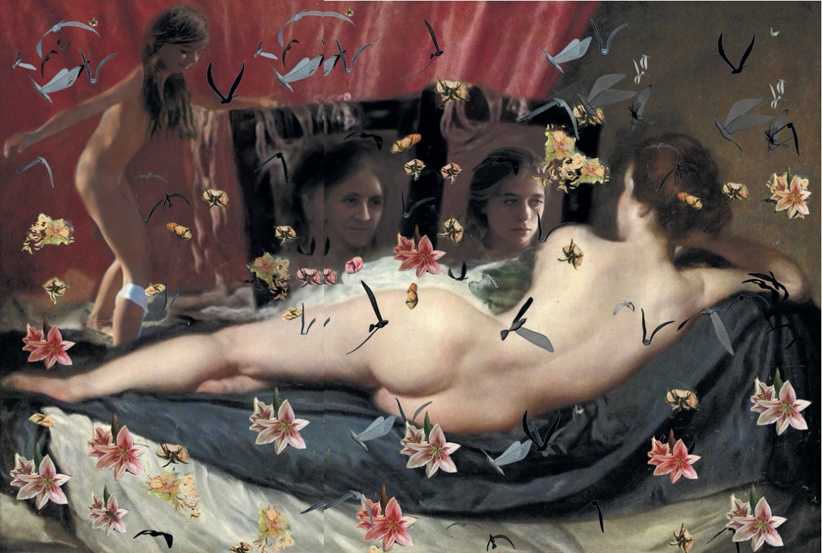 Στη σύγχρονη παρέμβασή της, Τρεις Γενιές Αφροδίτη (2020 Μεικτά υλικά, φως led 114x75x12 εκ.) η Ερατώ Χατζησάββα δεν απορρίπτει εξ ολοκλήρου τη ρητορική του βλέμματος, αλλά την ενισχύει και την παγιδεύει ταυτόχρονα. Το γυναικείο σώμα πλαισιωμένο από πολύχρωμα λουλούδια και πτηνά καθίσταται ακόμη πιο ελκυστικό, αλλά το βλέμμα του θεατή οδηγείται αναπόφευκτα από τη σάρκα στους διπλούς καθρέπτες. Αντί για έναν, όπως στον Velázquez, εμφανίζονται δύο, που δεν αντικατοπτρίζουν απλώς το πρόσωπο της θεάς, αλλά δύο διαφορετικές ηλικιακές καταστάσεις: τη νεότητα και το γήρας. Αντίθετα με την αχρονική, ιδεαλιστική Αφροδίτη της Αναγέννησης και του Μπαρόκ, η Αφροδίτη της Χατζησάββα έχει ηλικία, υπόκειται στον χρόνο και στη φθορά. Η αποθέωση της αιώνιας θηλυκής ομορφιάς υπονομεύεται εκ των έσω, και το κάτοπτρο μετατρέπεται από εργαλείο ναρκισσιστικής επιβεβαίωσης, σε συσκευή χρονικότητας, μνήμης και υπαρξιακής αγωνίας.
