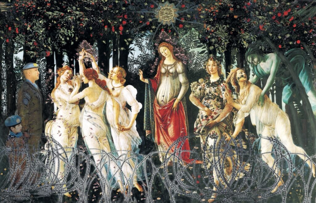 Η καλλιτέχνις, ως Κύπρια, αντικαθιστά τον Ερμή και το υπερυψωμένο Κηρύκειό του, το παραδοσιακό σύμβολο του λόγου και της μεσολάβησης, με την ακίνητη μορφή του στρατιώτη, υπονοώντας ότι ο διάλογος έχει αντικατασταθεί από τη μόνιμη επιτήρηση. Η παρουσία του παιδιού-στρατιώτη, λειτουργεί ως τραυματική προφητεία ότι, η ειρηνευτική δύναμη παύει να είναι προσωρινή και κληρονομείται στις επόμενες γενιές. Η στρατιωτικοποίηση γίνεται δομικό στοιχείο της κυπριακής Άνοιξης. Αυτή η πολιτική αλληγορία φορτισμένη με ειρωνεία, χωρίς να απεικονίζει ευθέως τη βία μιλά για τη συνήθεια της βίας και, ιδίως, για την εξοικείωση με το τραύμα ως φυσική συνθήκη. Η Χατζησάββα με ευρηματική ευφυΐα εικονογραφεί την μακροχρόνια φθορά μιας ανοιχτής πληγής, την άνοιξη μιας χώρας χωρίς λύση.