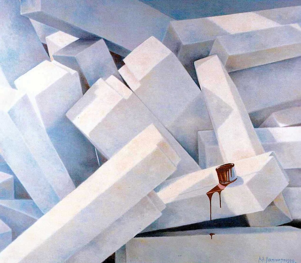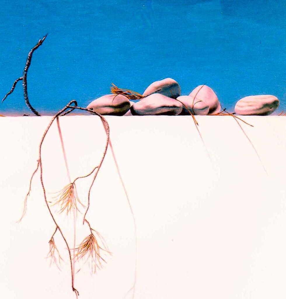 Το 1982, η Αθηνά Λατινοπούλου (Θεσσαλονίκη 1946), που κάνει το ντεμπούτο της με την ενότητα ‘Βότσαλα & Ρίζες’ (Gallery Ζυγός), είναι μια κατασταλαγμένη ζωγράφος του Ρεαλισμού.