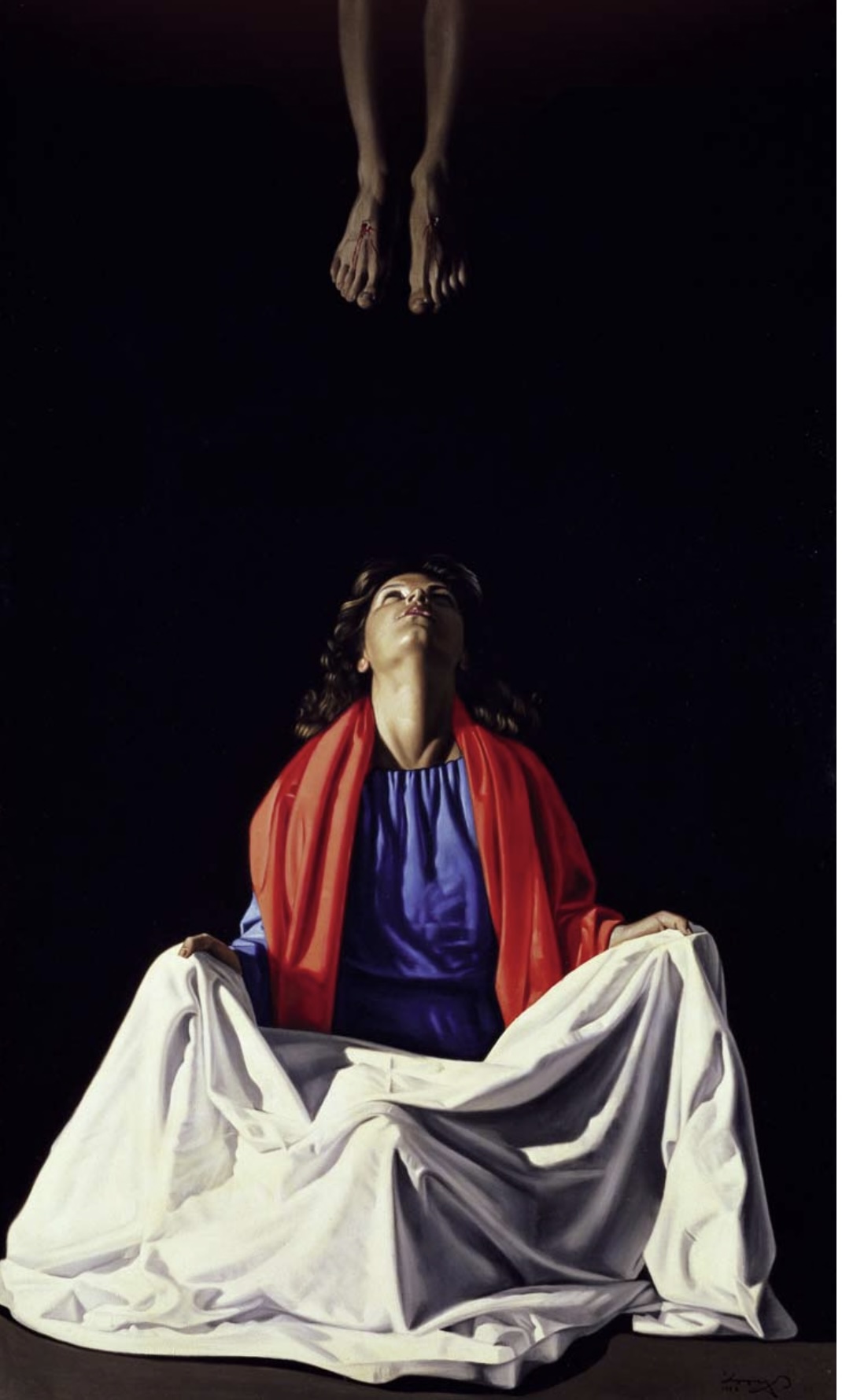 Η Αποκαθήλωση του ζωγράφου Άγγελου (1983) απεικονίζει μια γυναίκα να κοιτάζει προς τα πόδια μιας αιωρούμενης μορφής που φέρει πληγές, οι οποίες ενδεχομένως συμβολίζουν τον Χριστό. Η δραματική χρήση του chiaroscuro και η τοποθέτηση των χεριών της παραπέμπουν σε αναπαραστάσεις της Παναγίας ή σε σκηνές Θρήνου. Οι χρωματικές αντιπαραθέσεις του κόκκινου, του μπλε και του λευκού γίνονται πολύ πιο έντονες στο πυκνό μαύρο φόντο. Ιδίως οι πτυχώσεις του λευκού υφάσματος αποκτούν μια ανάγλυφη ποιότητα, ενισχύοντας την αληθοφανή γλυπτική διάσταση της σύνθεσης. Η σκηνοθετημένη στάση και η σχολαστική περιγραφική ακρίβεια δημιουργούν μια φωτορεαλιστική σύνθεση που παραμένει ρεαλιστική αλλά διαπνέεται από μια εξιδανικευμένη μεταφυσική αίσθηση. Ο ιδεαλιστικός ρεαλισμός του ζωγράφου Άγγελου προσφέρεται για μια εξιδανικευμένη, πνευματική ερμηνεία που προσομοιάζει με μια εξιδανικευμένη θρησκευτική αφήγηση.
