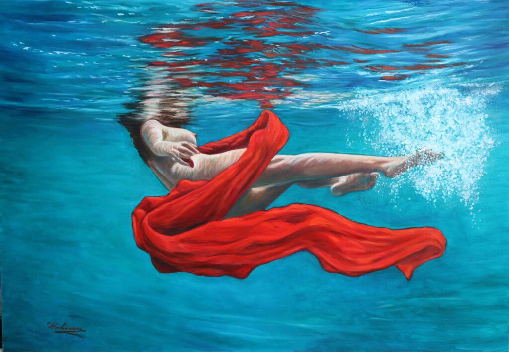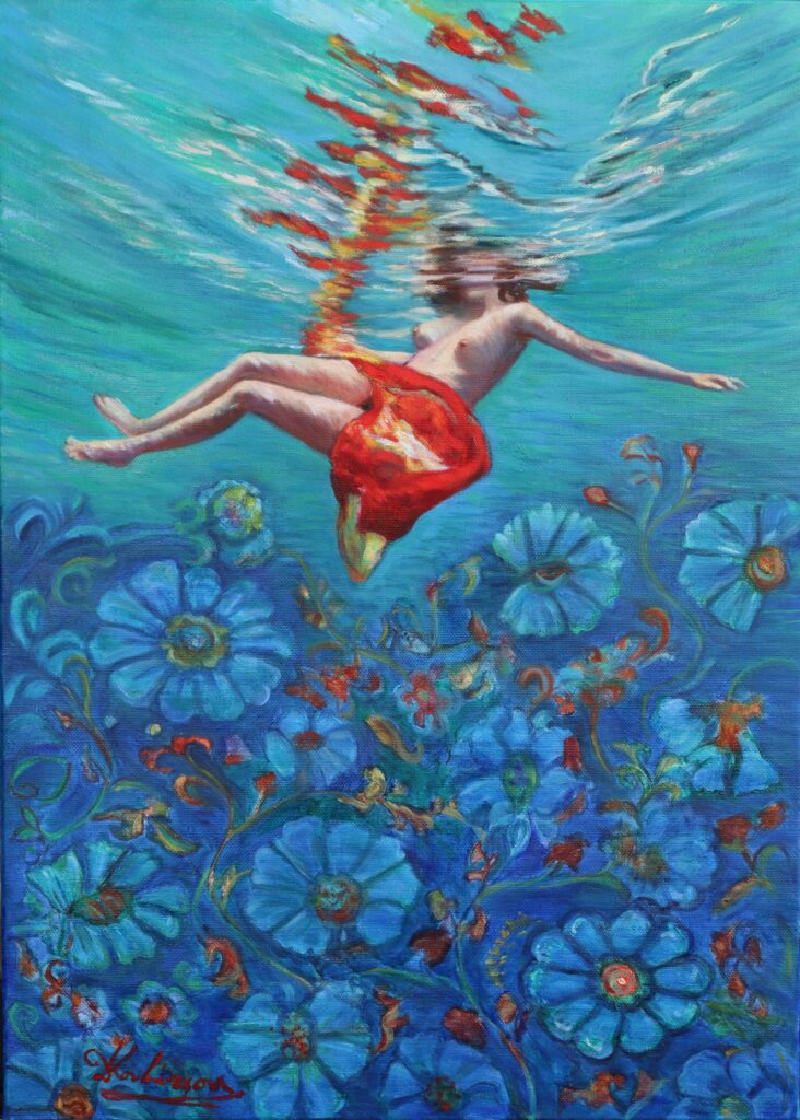 The persistent presence of fabric is neither decorative nor merely chromatic. It functions as a scenographic device that transforms the underwater scene into choreography: it intensifies the image, breaks the blue monochrome, and becomes an instrument for revealing the body—organizing space through its movement and inscribing light, dance-like trajectories. In this way, Kouvatsou avoids the potential monotony of realism, insisting on variations in which the same theme is renewed through the shifting relation between body, water, and fabric, like a visual choreography unfolding across the canvas. The “underwater Aphrodite” ceases to operate as a simple iconographic motif and becomes a means of investigating fluid identity, corporeal vulnerability, and the suspension of time. (https://www.periou.gr/ giannis-kolokotronis-i-synaisthimatiki-noimosyni-tis-zografikis-tis-despoinas-kouvatsou/)