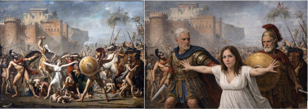 From an artistic standpoint, the incorporation of a contemporary face into a historical model need not be reproduction; it can be a transformation. The face is detached from its original context and reinscribed within a new visual and conceptual environment as a bearer of role, symbol, and narrative. This is precisely the difference between use and appropriation. When the image does not claim historical authenticity or seek to substitute for the original, but openly declares its anachronism, it moves from copying to interpretation. In such cases, AI functions as an instrument of conceptual synthesis rather than a mechanism of forgery.