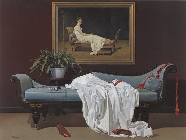In Greek painting, a comparable logic of visual anachronism appears in the work of Achilleas Drougas—not through AI, but as a pre-algorithmic model of rewriting the history of the image. In Lost Récamier (1985), a conceptual variation on David’s Madame Récamier, the figure is removed and replaced by contemporary traces (a sheet, a ribbon, Walkman headphones, red high heels). The image shifts from presence to absence, activating memory as a field of interpretation. Here it becomes clear that AI does not invent anachronism; it accelerates it and scales it up.