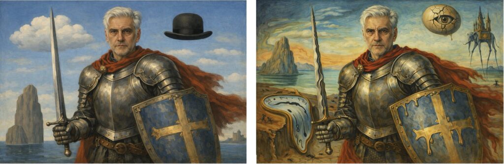 Σουρεαλιστικές αναδιαμορφώσεις σε στιλ Magritte και Dalí: αναχρονισμός ως δηλωμένη μυθοπλασία και εικόνα πιθανότητας.