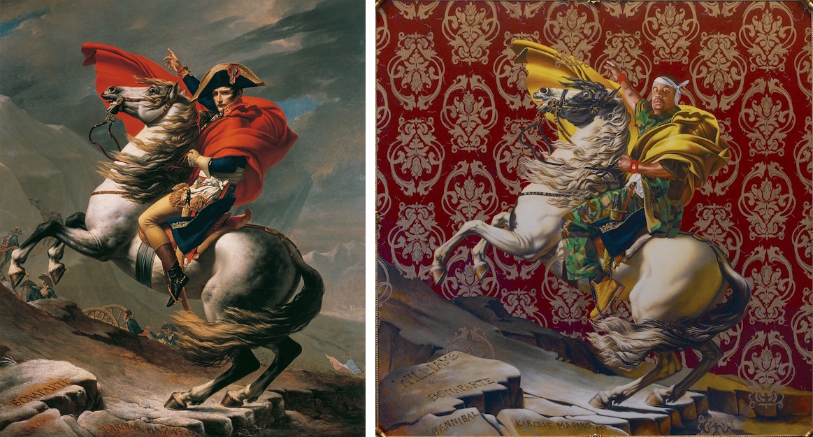 Χαρακτηριστικό παράδειγμα είναι το κλασικό έργο του Kehinde Wiley, Napoleon Leading the Army over the Alps (2005 https://www.brooklynmuseum.org/en-GB/objects/169803), (βλ. Εικ.9) στο οποίο διατηρούνται τα βασικά εικονογραφικά στοιχεία του Jacques-Louis David (δυναμική στάση, ρητορική χειρονομία, σκηνοθετημένη δόξα), όμως ο ιστορικός ήρωας αντικαθίσταται από έναν σύγχρονο μαύρο άνδρα με σύγχρονη αστική ενδυμασία. Ο Wiley δεν αντιγράφει το παρελθόν αλλά το ξαναγράφει σαν ιστορική εικόνα ηρωοποίησης. Έτσι, το «να έχεις υπάρξει εκεί» μετασχηματίζεται σε «να μπορείς να είσαι εδώ».