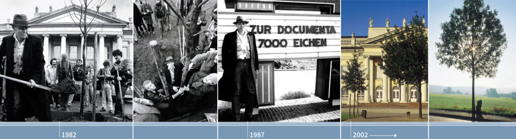 Ο Joseph Beuys, έδωσε παράδειγμα της μετασχηματιστικής δυνατότητας της τέχνης, με το έργο του 7000 Oaks, το 1982 στο Κάσελ της Γερμανίας (Beuys, 2023). Με το σύνθημα «Αστική δάσωση αντί για αστική διοίκηση», ο Beuys φύτεψε 7.000 βελανιδιές, κάθε μία από τις οποίες αντιστοιχούσε σε μια πέτρα από βασάλτη, καλώντας τους κατοίκους να αναλάβουν την ευθύνη για την ανατροφή των δέντρων. Σήμερα η πόλη, είναι ζωντανή απόδειξη του οράματός του για οικολογική ανανέωση, τη συμμετοχή της κοινότητας και της διαρκούς σχέσης του ανθρώπου με τη φύση.