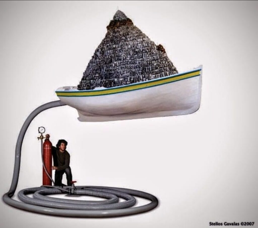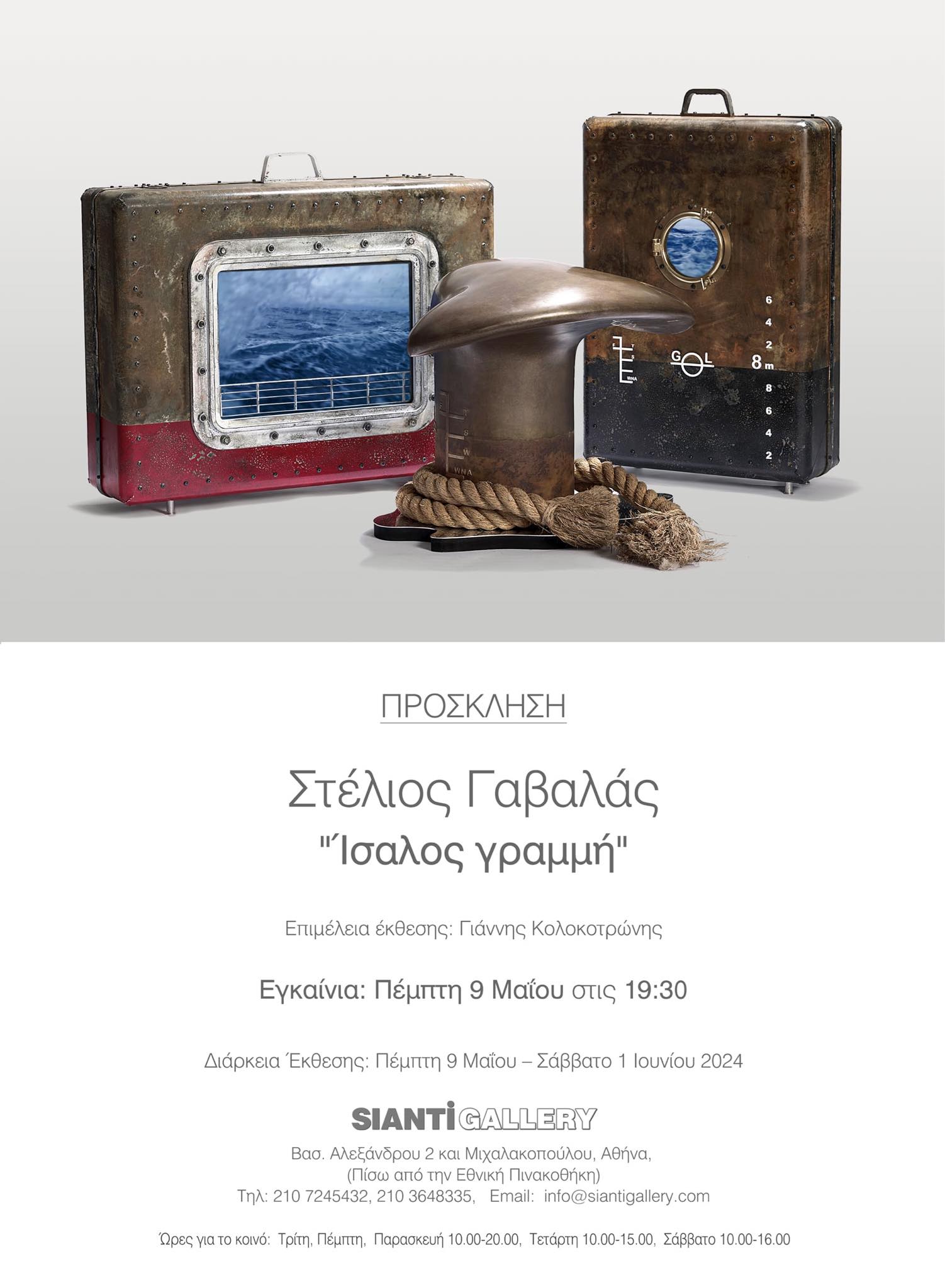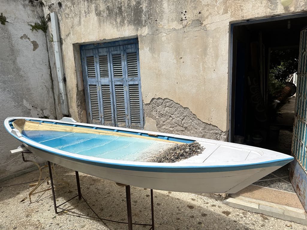 Κι αν το εργαστήρι ενός ζωγράφου είναι γεμάτο από καμβάδες, χρώματα και πινέλα το εργαστήρι του Στέλιου Γαβαλά (https://steliosgavalas.com/) είναι γεμάτο δεκάδες εργαλεία κάθε τύπου τόσο πολύ που νομίζεις ότι έχεις μπει σε κατάστημα εργαλείων. Ντέξιον με χρώματα και κόλλες σαν να επισκέπτεσαι ένα χρωματοπωλείο, δεκάδες μικροαντικείμενα που όσο κι αν προσπαθήσεις δύσκολα μπορείς να φανταστείς πώς θα τα χρησιμοποιήσει, μικρές μεγάλες μπουκάλες οξυγόνου, ράφια με προπλάσματα, ράφια με παλιότερα έργα, στο δάπεδο μεταλλικοί σκελετοί σε σχήμα βαλίτσας που περιμένουν τη σειρά τους για να συναρμολογηθούν σε νέα έργα κι έξω στις σκάλες του εργαστηρίου, μια μικρή βάρκα σχεδόν ολοκληρωμένη που αναμένει υπομονετικά τις μεταμορφωτικές επεμβάσεις του. Η τάξη ή, η ακαταστασία είναι μια πρόκληση. Αλλά μέσα σ’ αυτό το φαινομενικό χάος, αναδύεται μια ζεστή αίσθηση αρμονίας. Και το να βλέπεις τα έργα σε εξέλιξη είναι μια περιπέτεια όπου το τελικό αποτέλεσμα παραμένει άπιαστο, ξεπερνώντας ακόμη και τις πιο ακριβείς περιγραφές του καλλιτέχνη.
