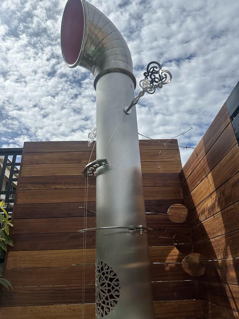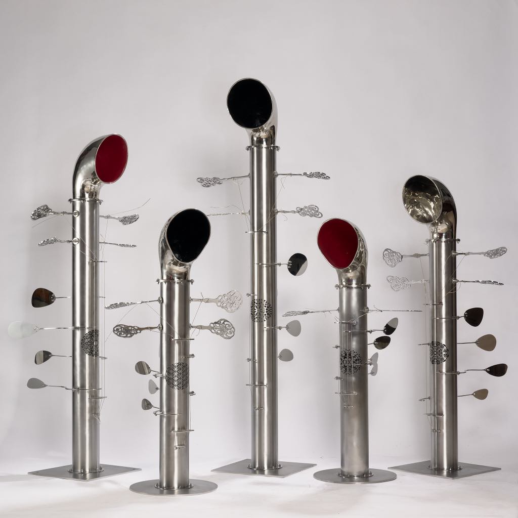 Τι επιδιώκει ο Στέλιος Γαβαλάς με το καινούργιο project αν δεν είναι μια συνδυαστική προσπάθεια να υφάνει έναν ιστό εμπειριών που ξεπερνούν τα όρια του χρόνου και της τεχνολογίας και να παρασύρει το θεατή σ’ ένα ταξίδι ακουστικής αίσθησης, μνήμης και συναισθήματος που συνδέει τους ανθρώπους; Πέντε γυαλισμένα φουγάρα πλοίων χάνουν της λειτουργική τους ιδιότητα και γίνονται αγωγοί για μια συμφωνία ήχων. Εξοπλισμένα και αυτά όπως τα Μουσικά Φουγάρα του Αλίμου, με ενσωματωμένα ηχεία μέσα στους κυλινδρικούς κορμούς τους, με χορδές και μουσικά κλειδιά εξωτερικά, να αντηχούν τους ήχους της θάλασσας και του ανέμου, δυναμώνοντας την ακουστική εμπειρία του χώρου, μεταμορφώνουν το ρεαλιστικό τους πλαίσιο και αλλοιώνουν τη μνήμη που θα αντικατασταθεί από την σύγχρονη ακουστική αισθητική.
