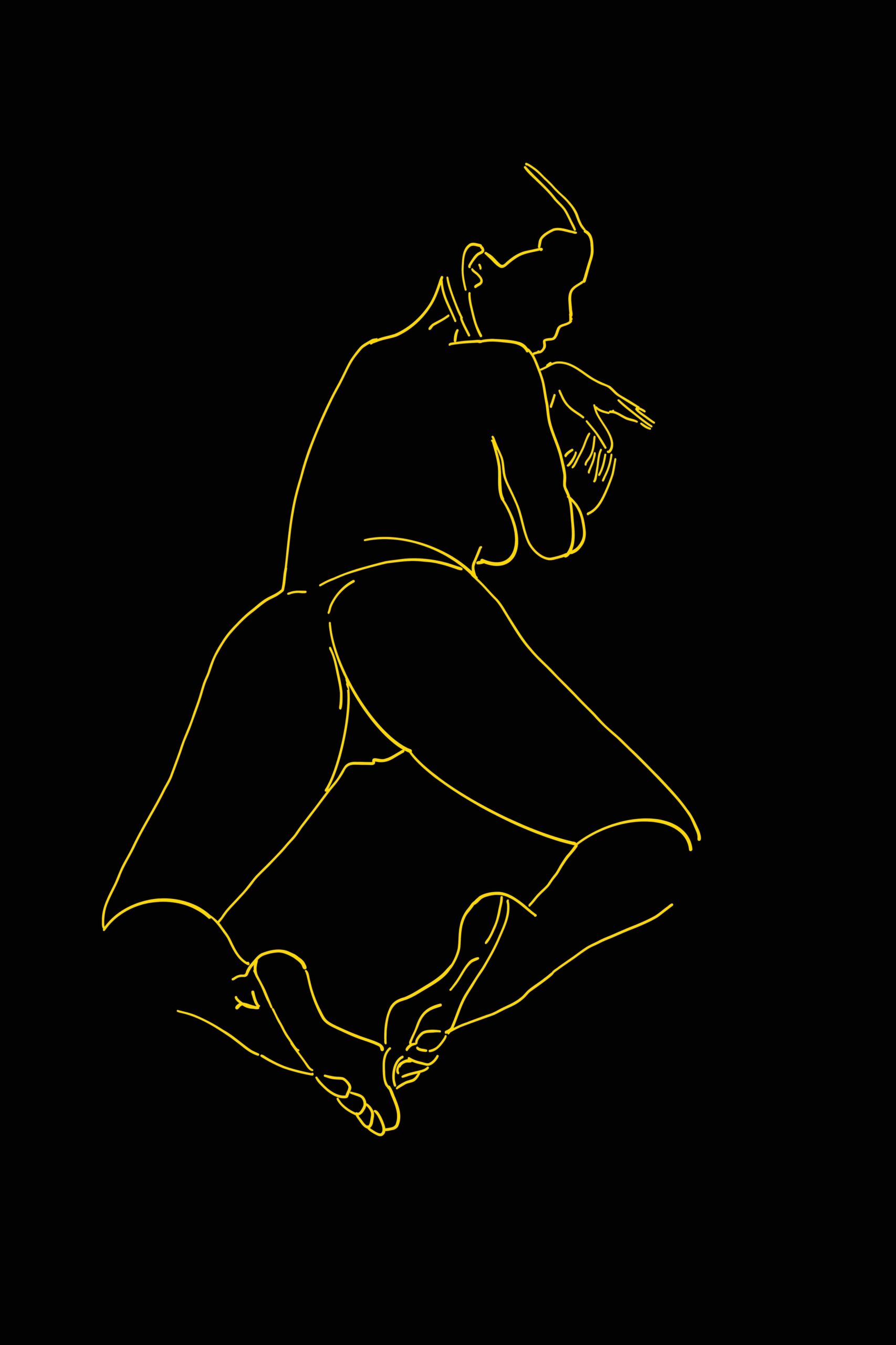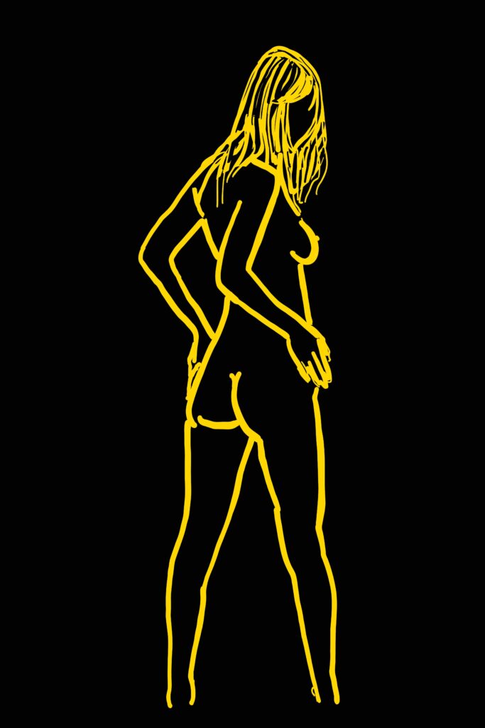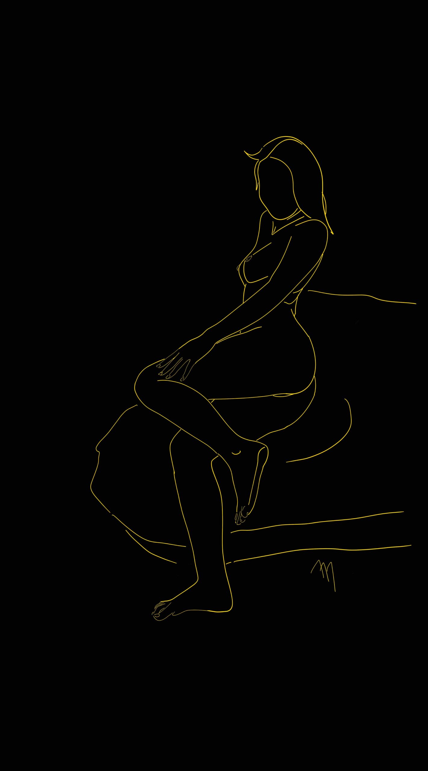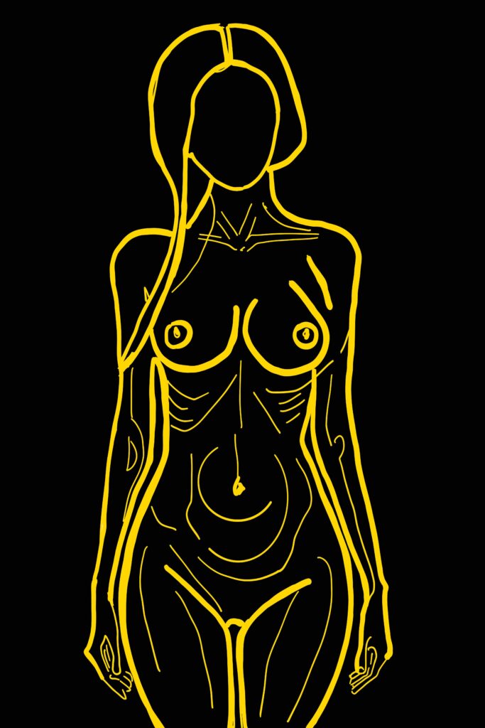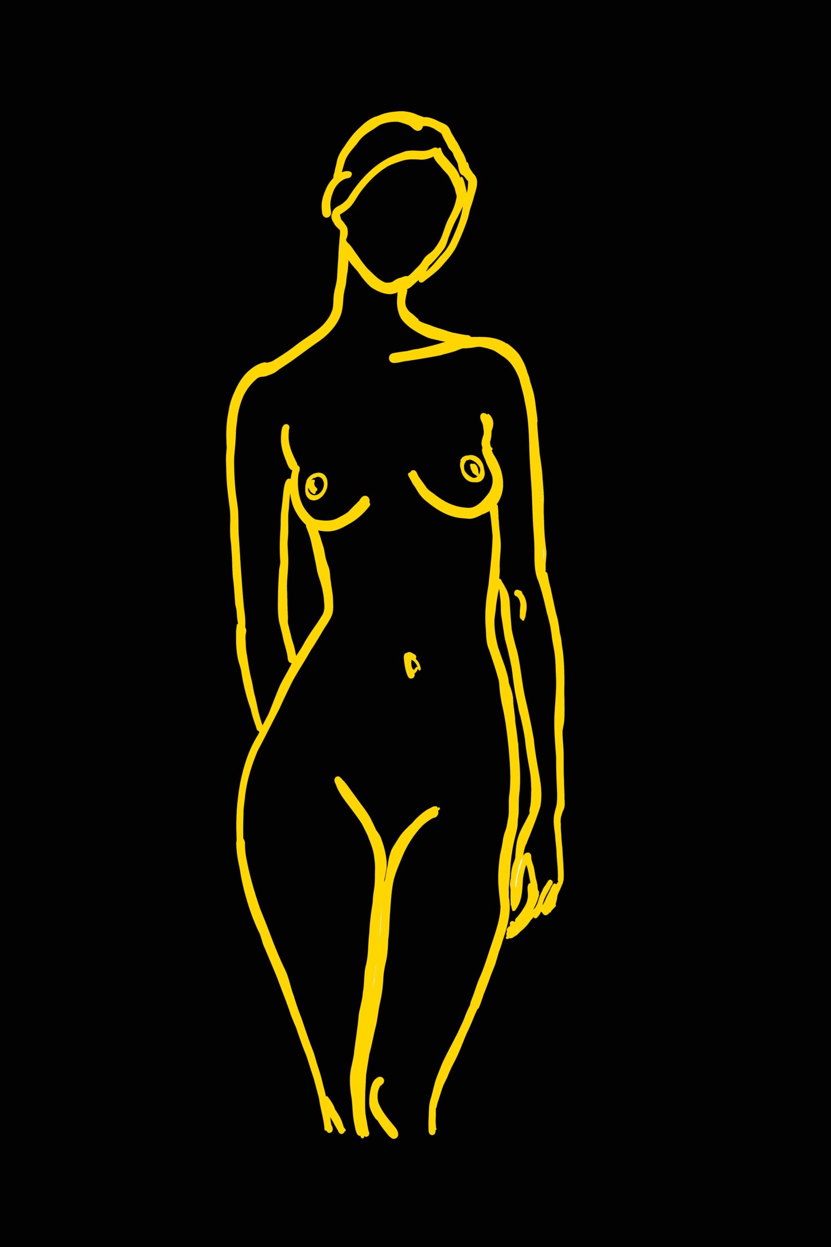 This series belongs to a visual tradition that unites the nude body with the symbolism of light and radiance, exploring the relationship between corporeality and apparition—an immaterial imprint that endures through time. The choice of golden engraving on a black field establishes a semiological system: gold elevates the female outline to a hieratic symbol, while the black background operates as an infinite field of silence and depth, like an astral constellation of forms emerging from darkness. It is as if stardust were scattered across a black universe, crystallizing into the very idea of woman.