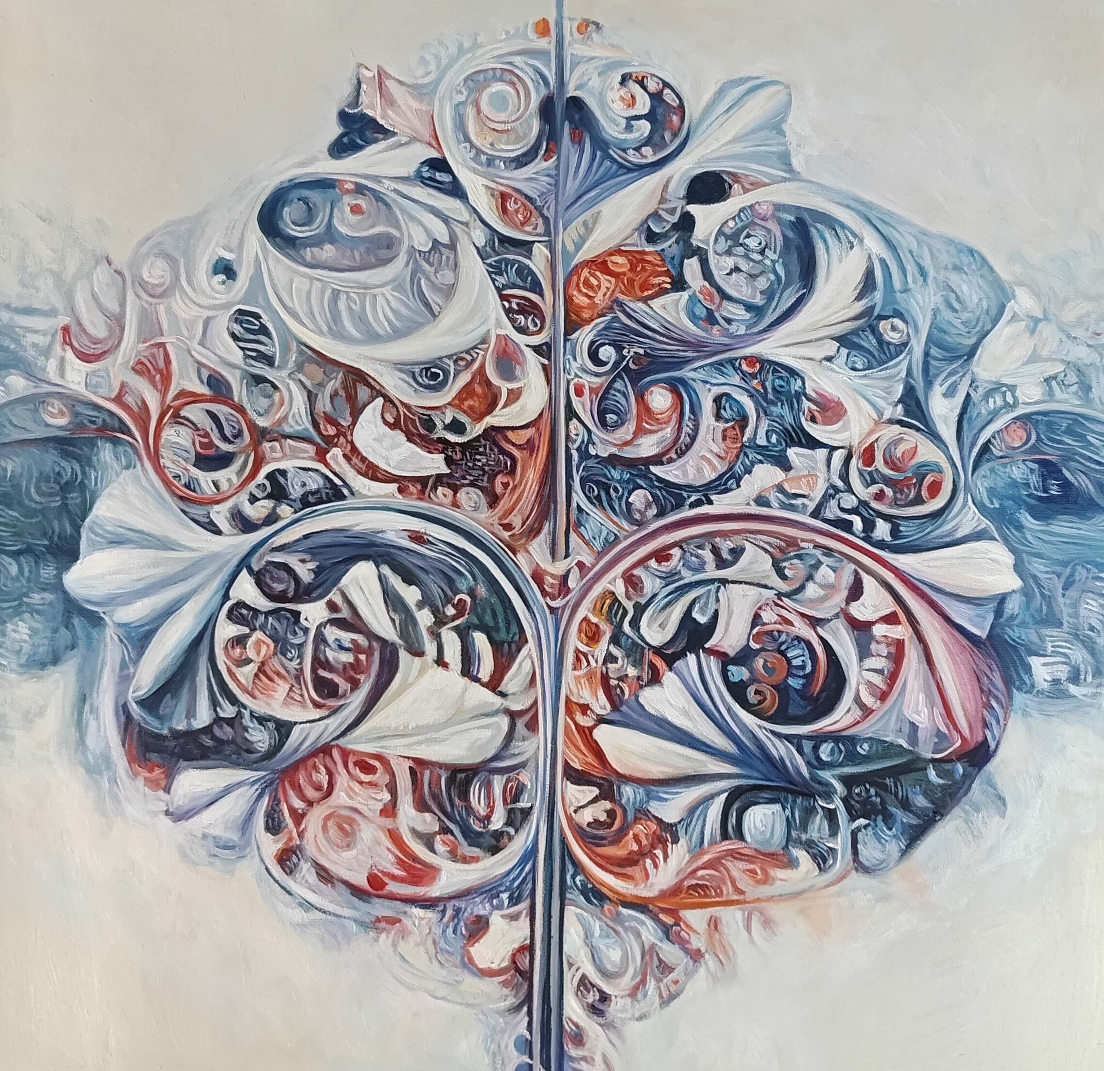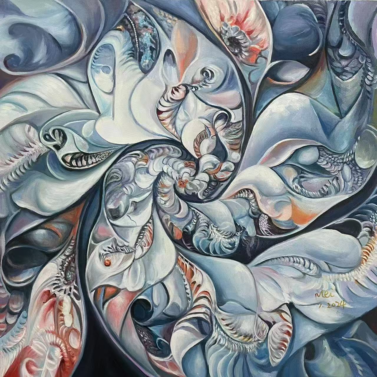 This technique is not the result of intuitive gesture alone. Dongmei has developed a multi-layered abstract method, which she also applies in other series, such as Kaleidoscope. It is a form of “structured abstraction”, in which the painting is built up through successive layers of colour and gesture. Each layer retains traces of emotional outburst, while simultaneously submitting to a stricter logic of organization, rhythm and symmetry. The process of “layering / overpainting / correction / reconfiguration” transforms the painted surface into a field where the accidental and the calculated, the emotional and the rational, coexist in a dynamic equilibrium.