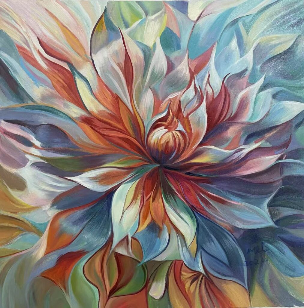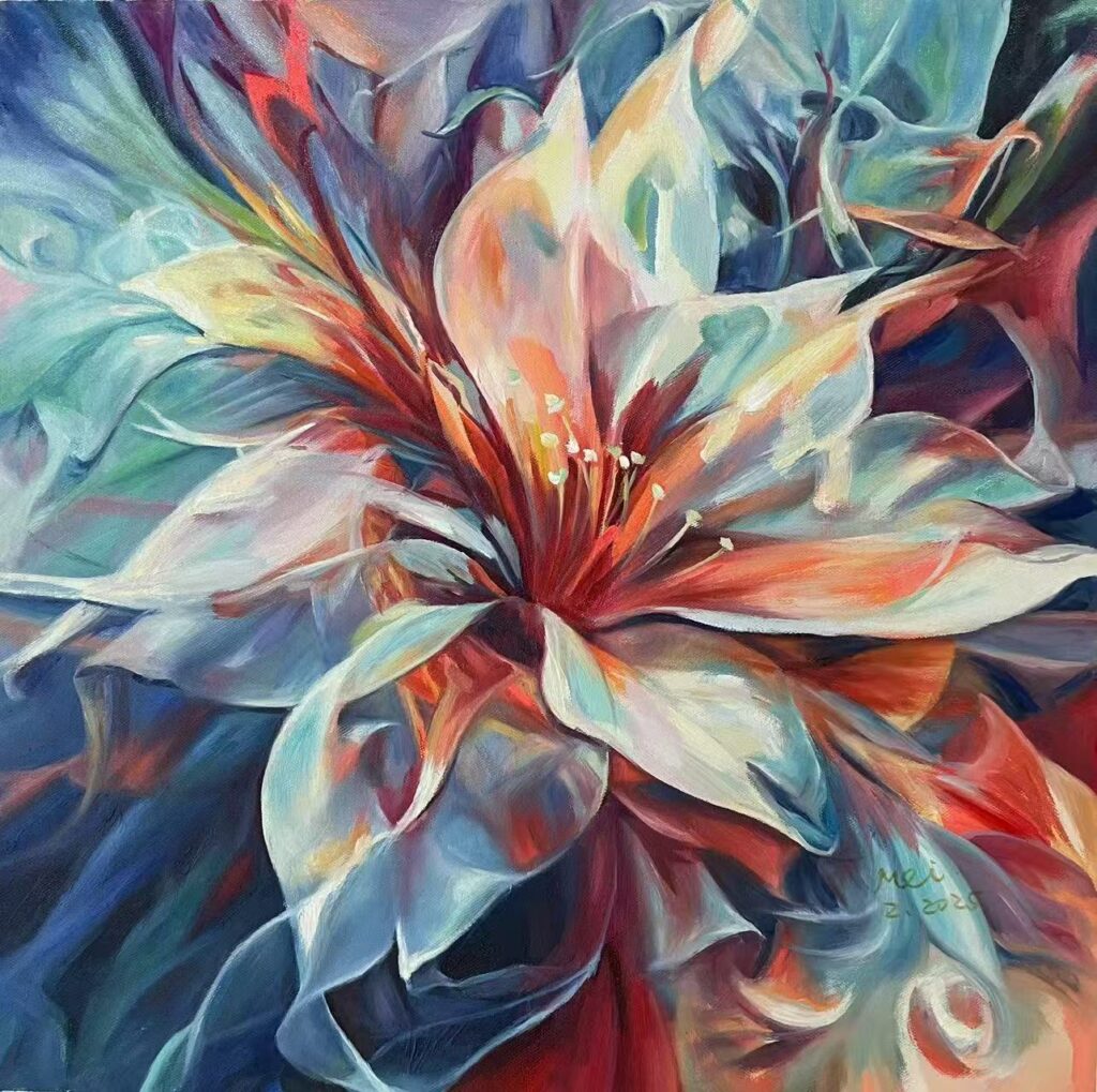In this light, Liang Dongmei’s painting can be read as a contemporary, intercultural rethinking of flower painting: a shift away from the display of abundance and the contemplative vanitas of the seventeenth century towards a lyrical, animistic conception of nature. Whereas Dutch and Flemish painters use the flower to speak of endings, Dongmei uses it to speak of continuity. Through her work, the flower ceases to be merely a symbol of decay and becomes a pictorial vehicle of a secret, ceaseless cycle of life, in which structured abstraction, chromatic explosion and an animistic gaze coalesce into a single, recognizable visual language.