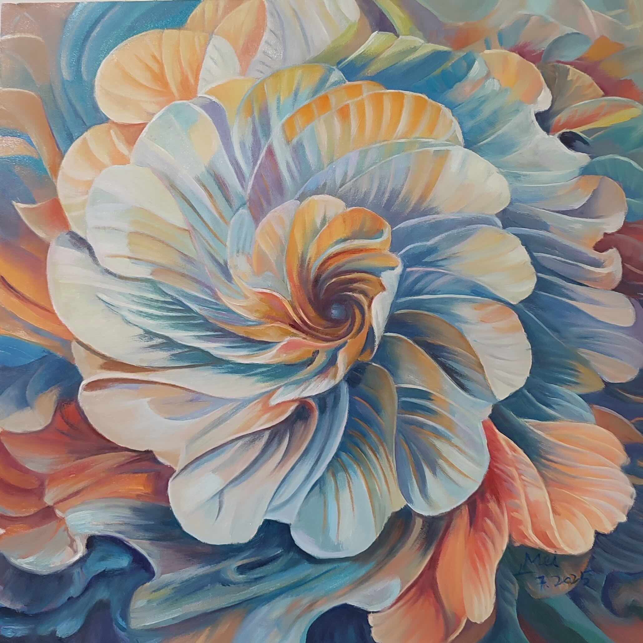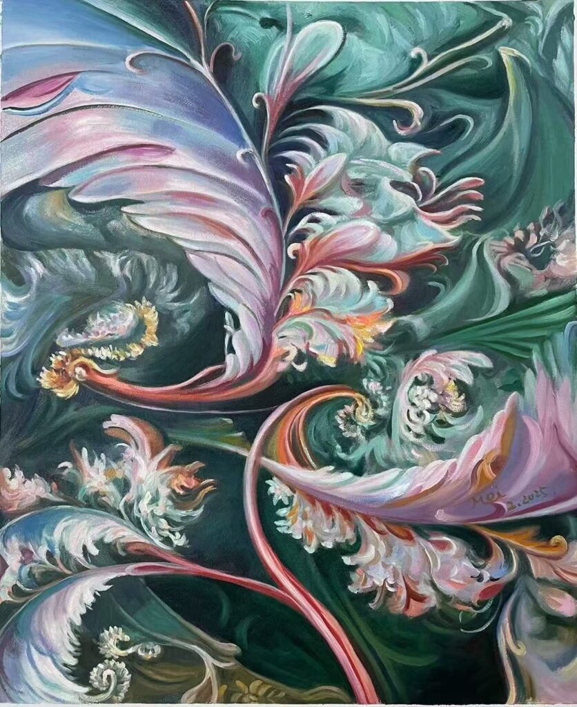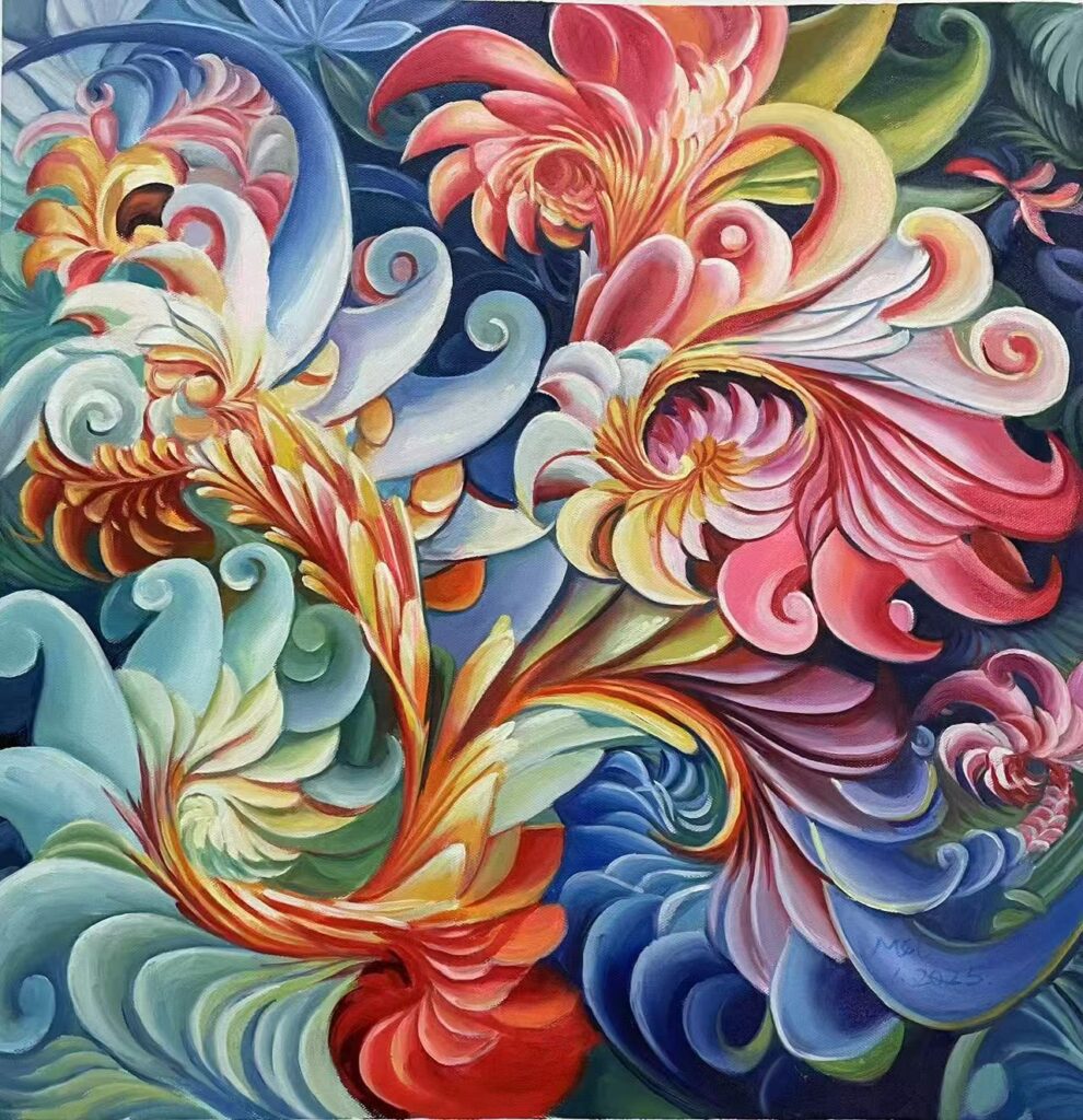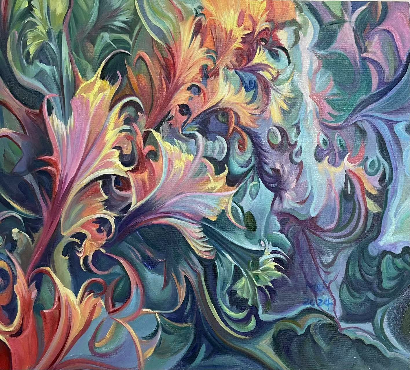 Within this theoretical framework, Liang Dongmei can be seen as an artist who engages with the Dutch descriptive tradition of flower painting, while at the same time extending it through an Eastern gaze. If historical flower pieces are impressive, fully descriptive records of an ideal bouquet, Dongmei brings the viewpoint closer, to “close-up” images of fluid botanical forms, where the surface is no longer stable but in constant motion. Her flowers are not arranged in vases, nor confined within a strict central composition; they unfold across the surface of the canvas like spirals of light and water, creating the impression of an energetic field rather than a static, artificially lit bouquet.