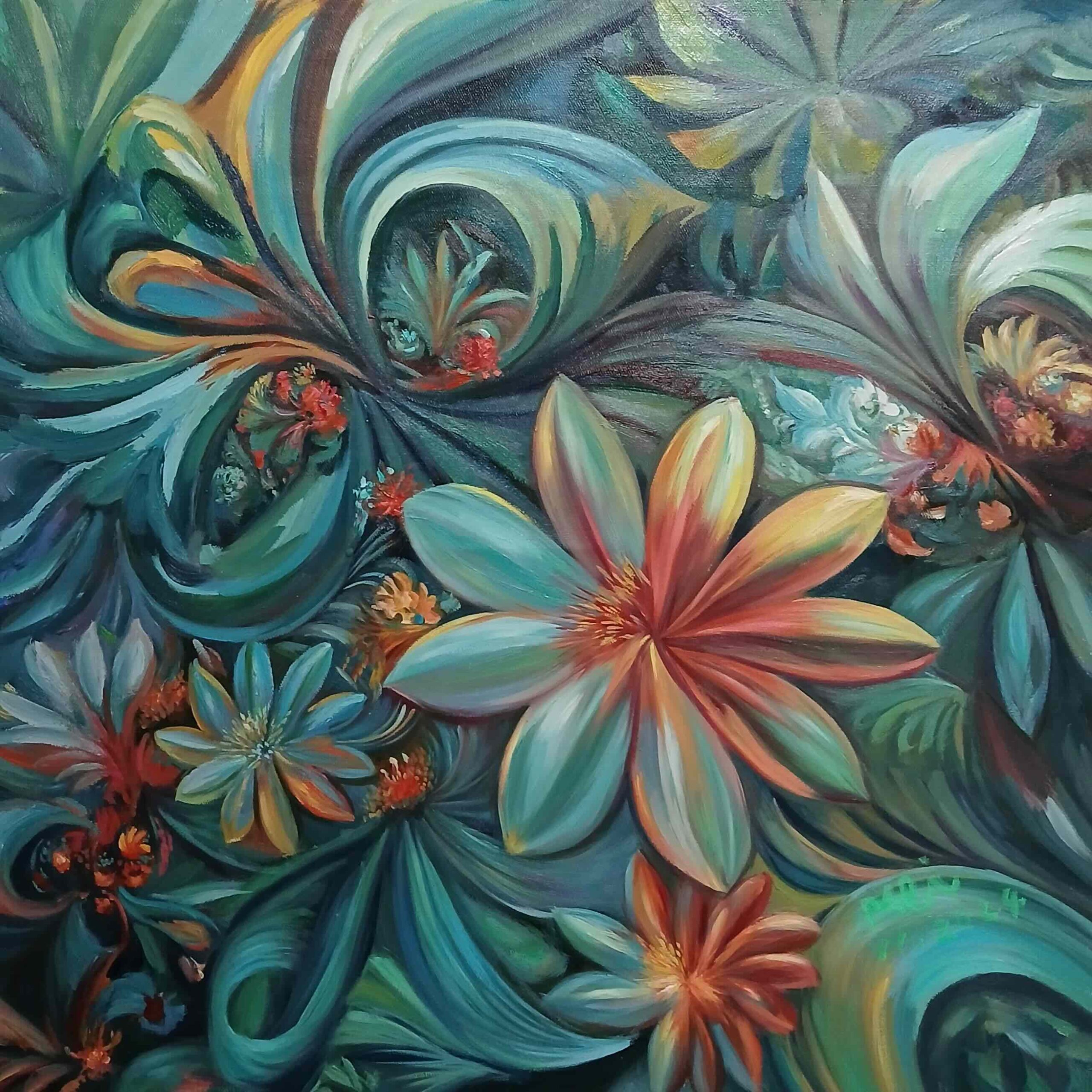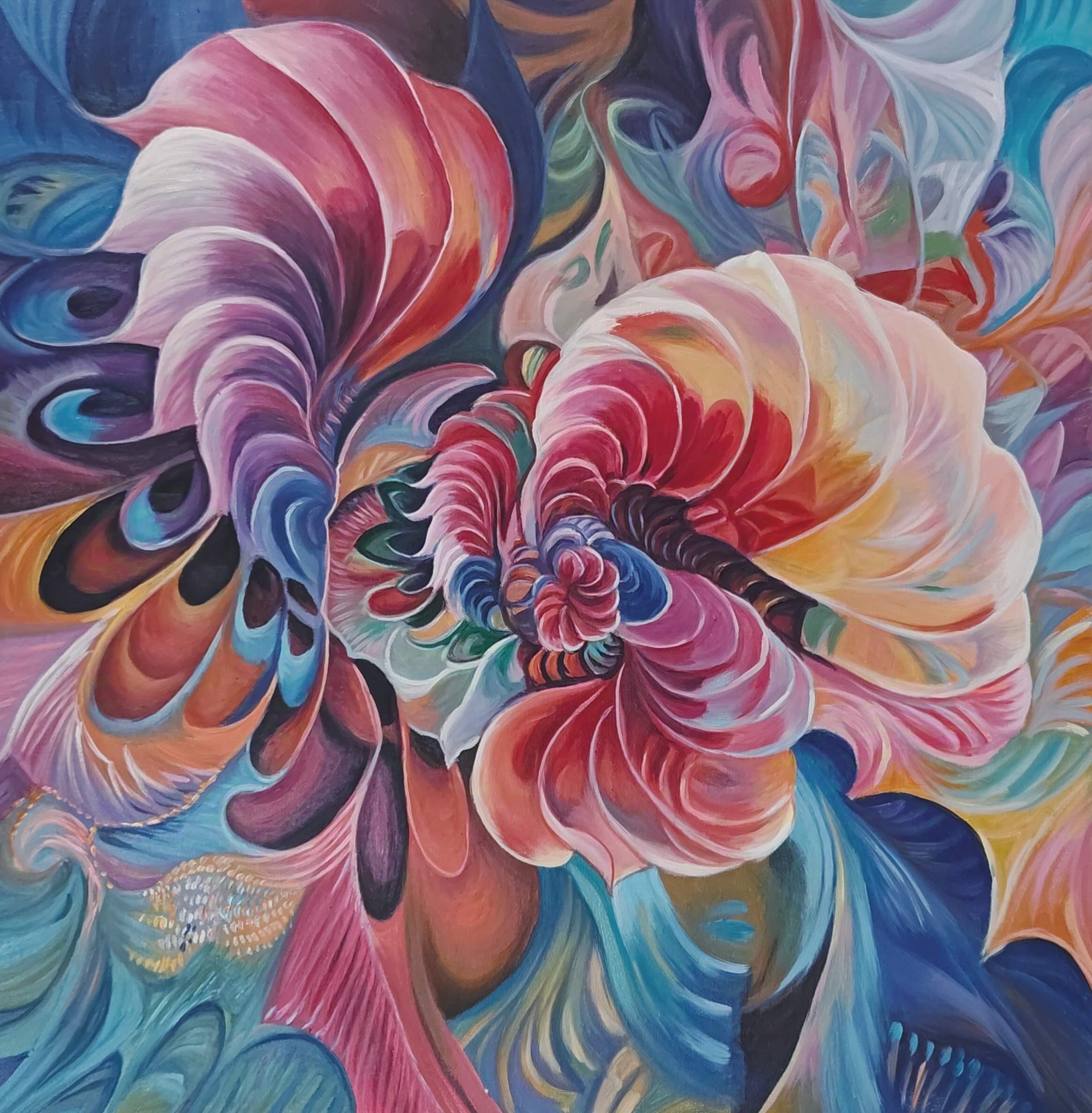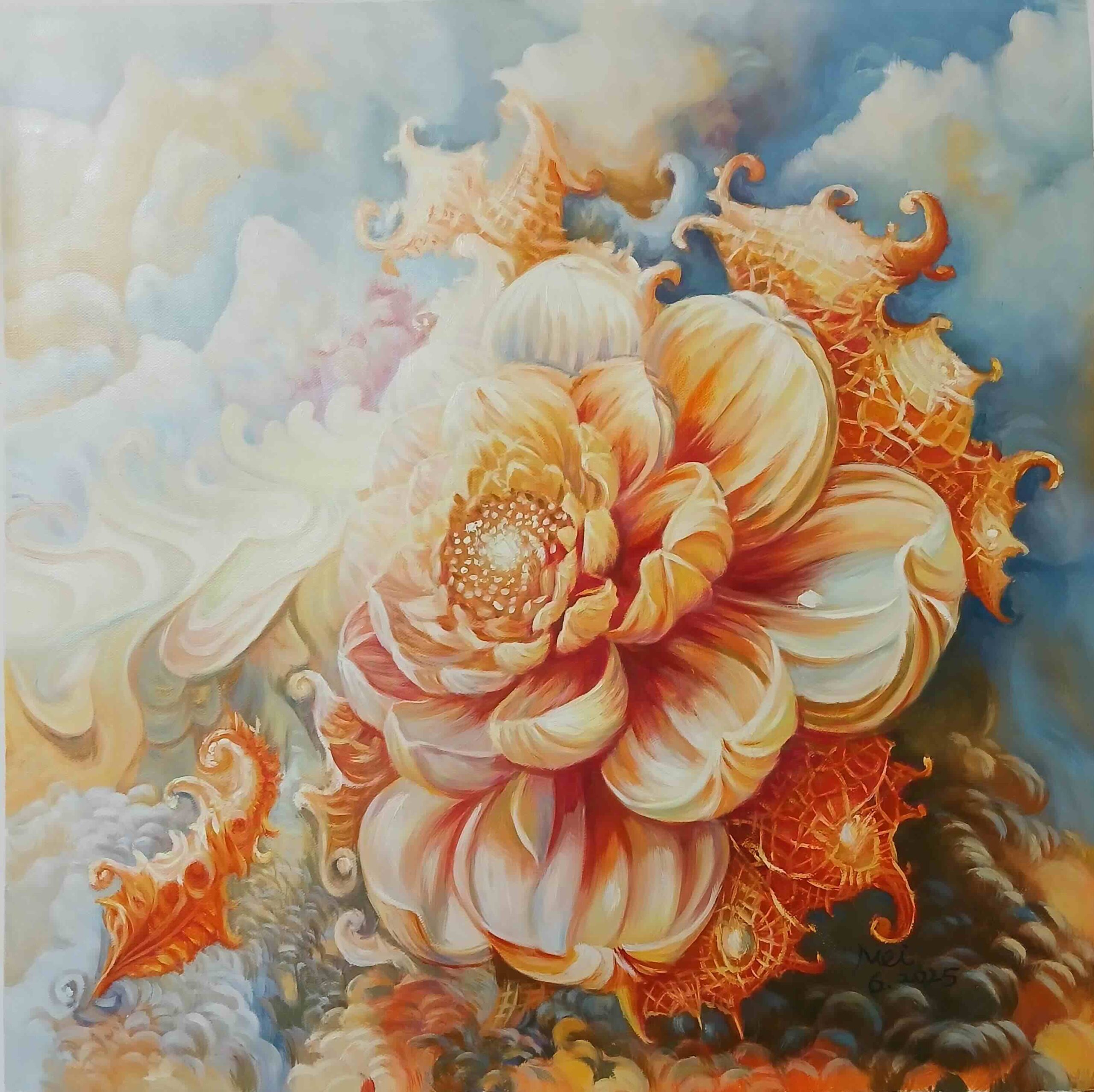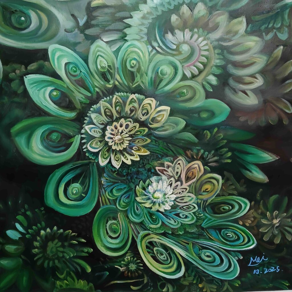 At the core of her work lies an obsessive, almost ritualistic commitment to flower painting. Series such as Floral Shadows and Rainbow Garments, Flowering Season and The Mysterious Language of Flowers: The Chain of Life show that the flower is not treated as a mere decorative element, but as a bearer of a worldview informed by the Eastern spirit of animism. Her floral motifs are rendered as organisms in constant transition, symbolizing continuity and the cycle of life, and highlighting the close, almost organic bond between life and the natural environment.