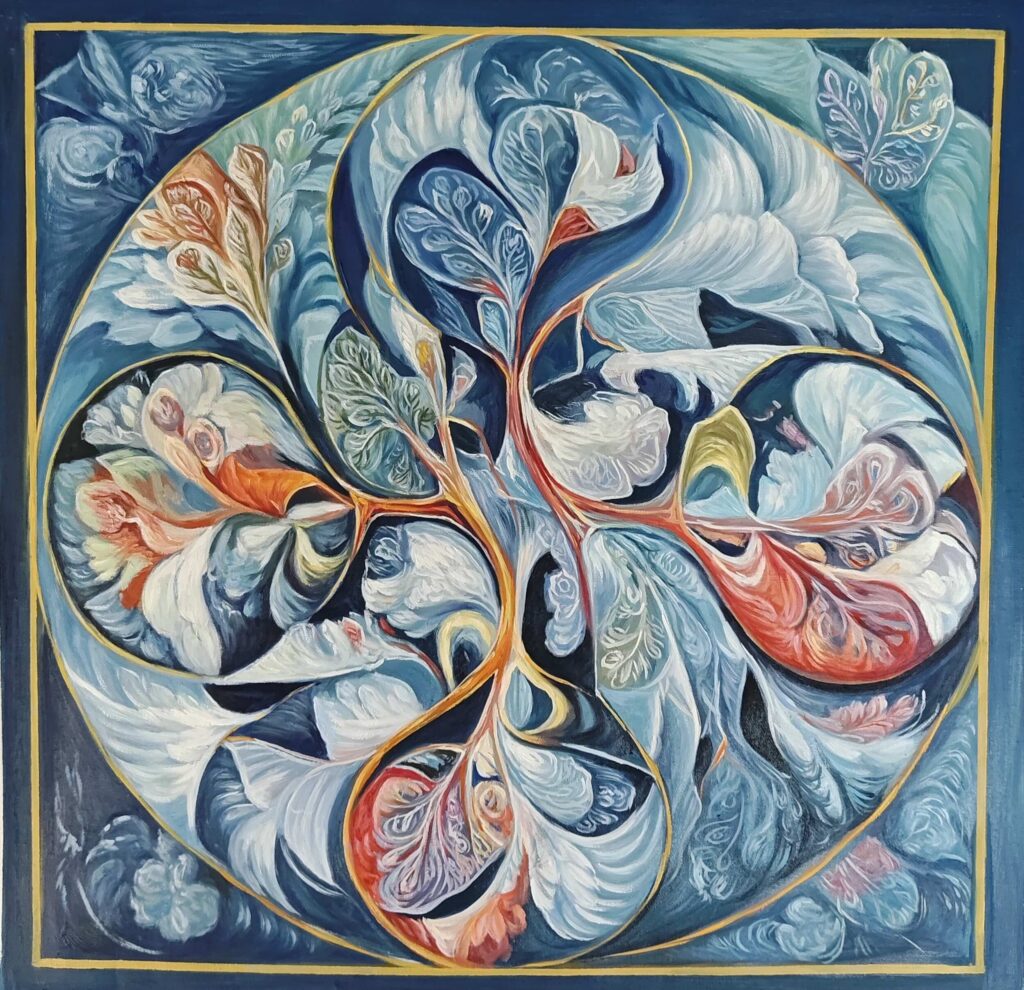 In her flower paintings, this method appears as eruptions of luminous colour fields and recurring rhythms, so that petals and leaves resemble “units” within an internal mathematical pattern. Her palette – concentrated on intense blues, pinks, oranges, yellows and greens – reinforces the impression of pulsating energy. If seventeenth-century flower painting reflects on the transience of matter, Dongmei proposes a shift in emphasis: from material decay to continuous energetic flow, from the end to the cycle.