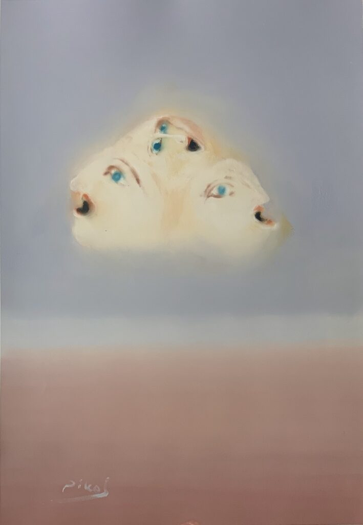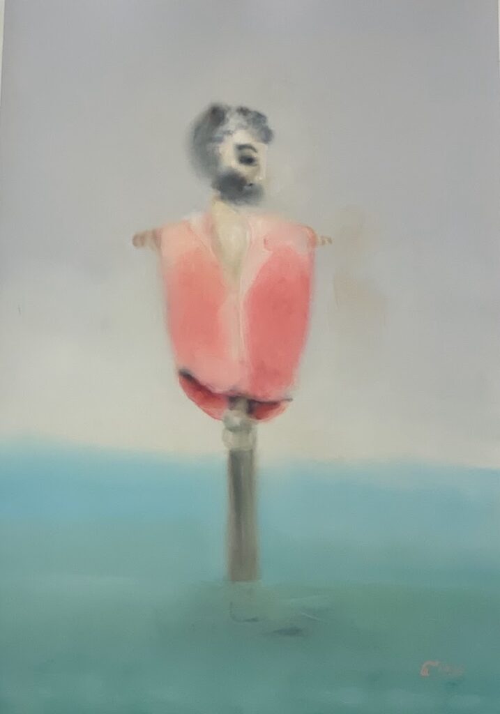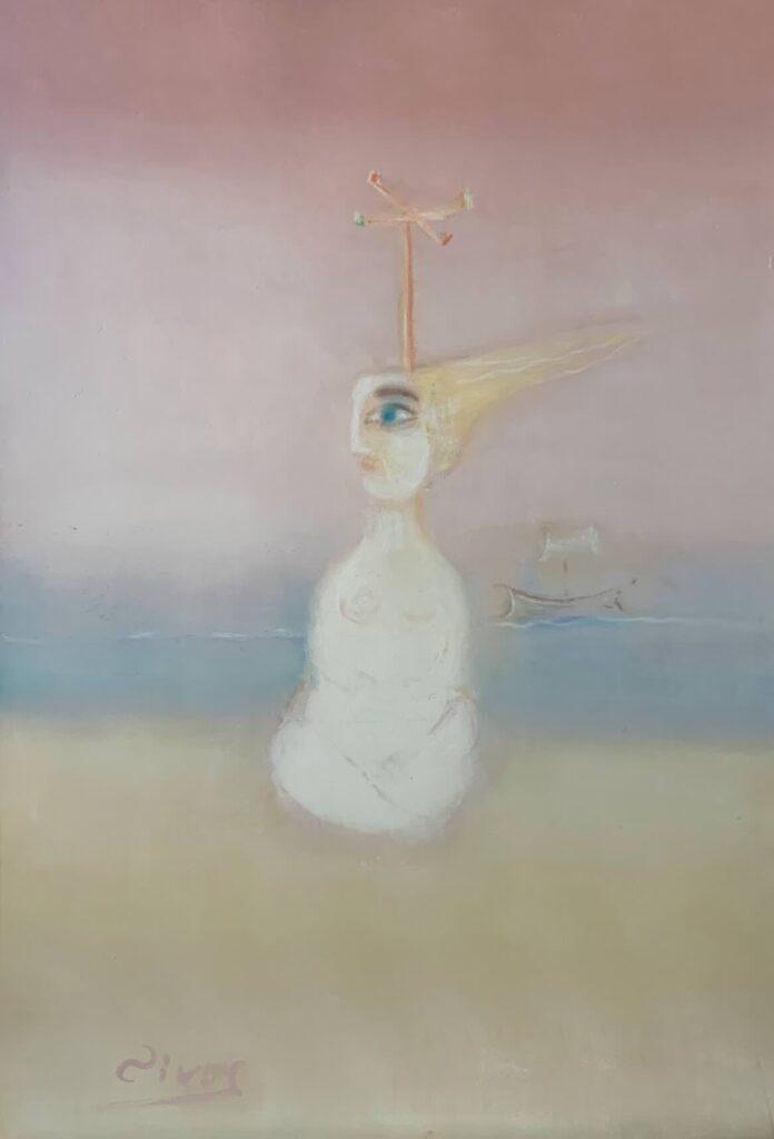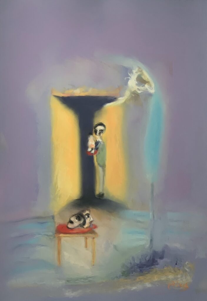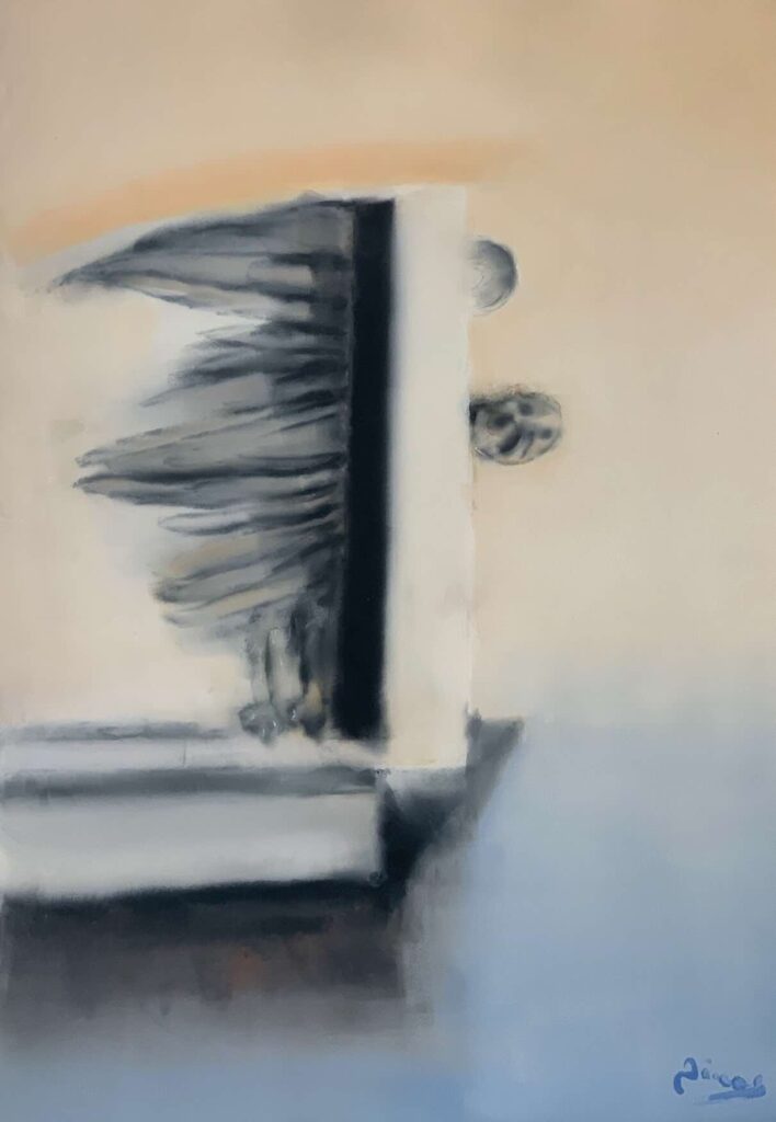 With a personal, well-developed, and flexible visual vocabulary — one that at times draws him near Expressionism, at others to Abstraction or Surrealism — he paints the liminal space between the real and the dreamlike. The familiar symbols of his recent works reappear: the oversized eye, levitation, and the distorting masks. To these are added hybrids (human–building, man–buoy), “orientation mechanisms” (woman–weathervane, traveler–sail), island fragments, candles, cypresses, and thresholds. Together they form scenes of self-observation in which the viewer does not follow a closed narrative but participates in the very process of image-formation. The haze, tonal gradations, and restricted palette (ochres, cool blues, neutral greys) dissolve the contours, allowing form to emerge slowly — at the pace of a dream. As Georges Didi-Huberman writes in Confronting Images (Penn State University Press, 2004), this is the “reverse side,” where forms lose clarity and resist rational comprehension.