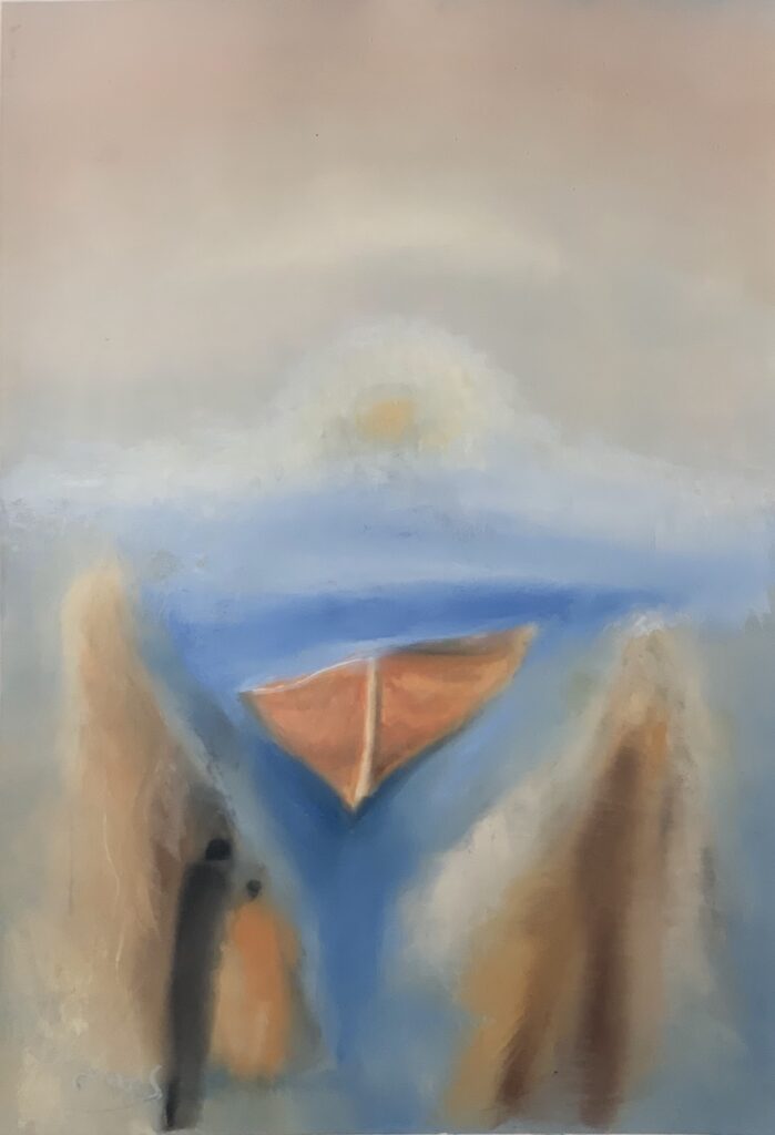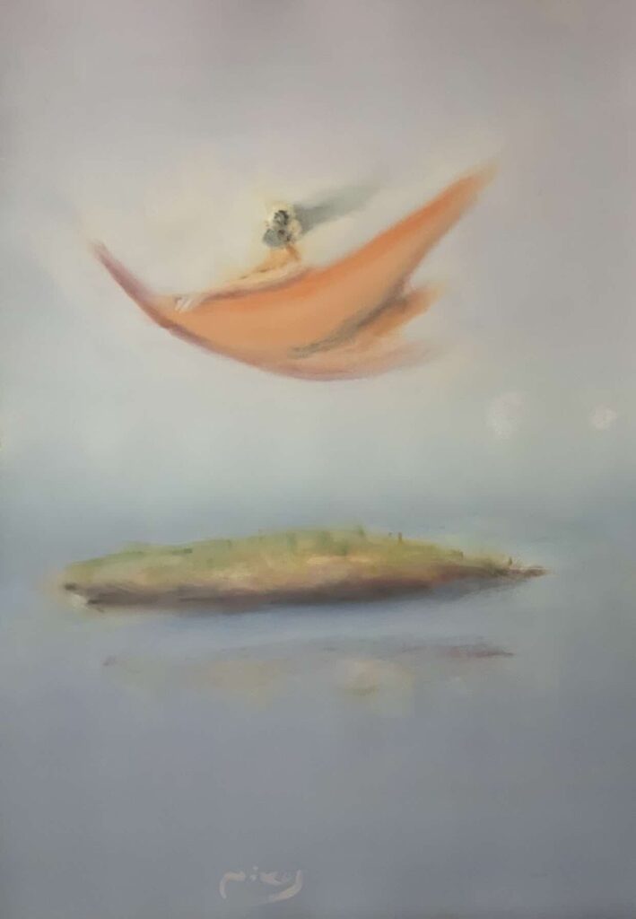 In Islands of Time, place is transformed into a chronotope: it ceases to be mere geography and becomes a reservoir of memory suspended between past and present. The islands, without becoming destinations, appear as temporal units — fragments of lived experience, familiar images eroded by dream. The delicate maritime horizon imposes a slow, ritual rhythm. Upon it float house-islands, chimneys, small shrines, boats, and figures, as if reenacting a secret ceremony, inviting the viewer to perceive that time in painting is not measured but inhabited. Thus, experience becomes a gentle ritual of transition — mourning, commemoration, gathering, anticipation, ecstasy.