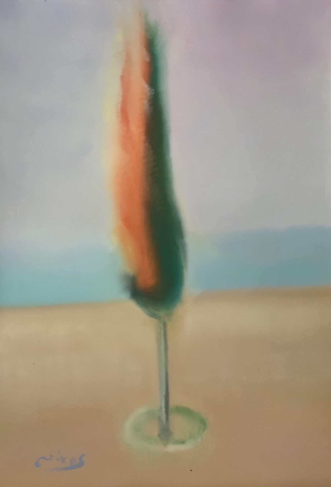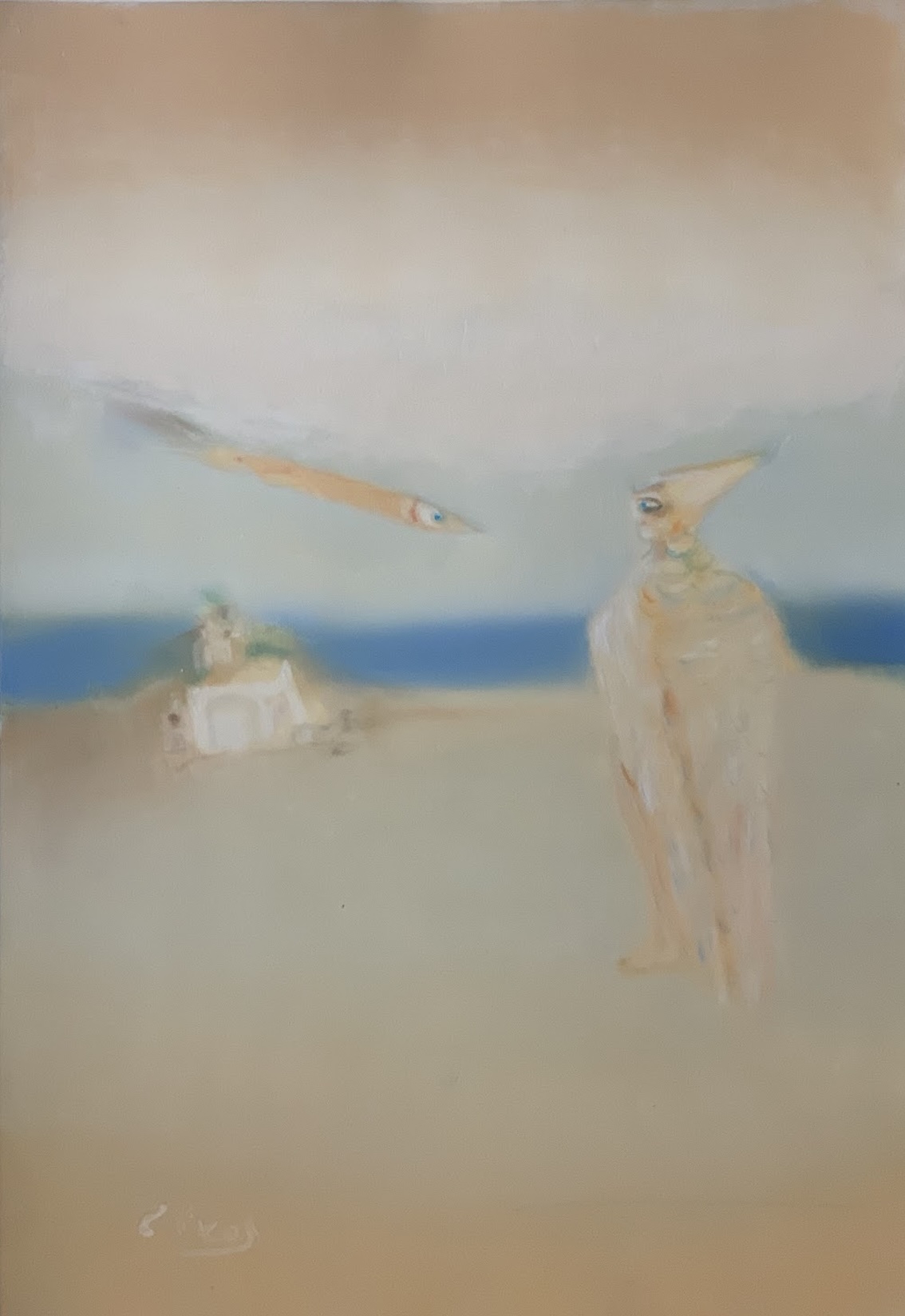 With a personal, well-developed, and flexible visual vocabulary — one that at times draws him near Expressionism, at others to Abstraction or Surrealism — he paints the liminal space between the real and the dreamlike. The familiar symbols of his recent works reappear: the oversized eye, levitation, and the distorting masks. To these are added hybrids (human–building, man–buoy), “orientation mechanisms” (woman–weathervane, traveler–sail), island fragments, candles, cypresses, and thresholds. Together they form scenes of self-observation in which the viewer does not follow a closed narrative but participates in the very process of image-formation. The haze, tonal gradations, and restricted palette (ochres, cool blues, neutral greys) dissolve the contours, allowing form to emerge slowly — at the pace of a dream. As Georges Didi-Huberman writes in Confronting Images (Penn State University Press, 2004), this is the “reverse side,” where forms lose clarity and resist rational comprehension.