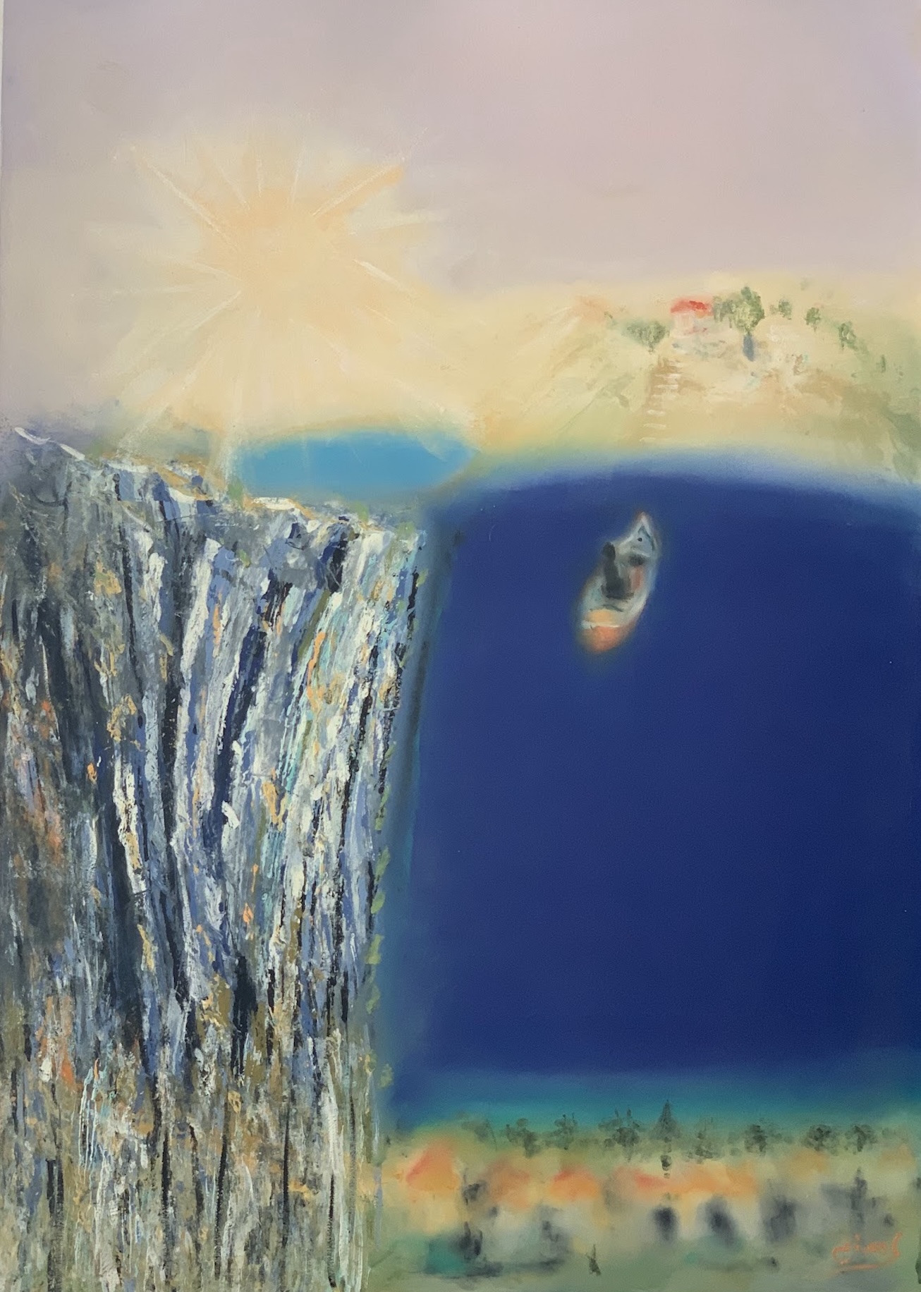 In Islands of Time, place is transformed into a chronotope: it ceases to be mere geography and becomes a reservoir of memory suspended between past and present. The islands, without becoming destinations, appear as temporal units — fragments of lived experience, familiar images eroded by dream. The delicate maritime horizon imposes a slow, ritual rhythm. Upon it float house-islands, chimneys, small shrines, boats, and figures, as if reenacting a secret ceremony, inviting the viewer to perceive that time in painting is not measured but inhabited. Thus, experience becomes a gentle ritual of transition — mourning, commemoration, gathering, anticipation, ecstasy.