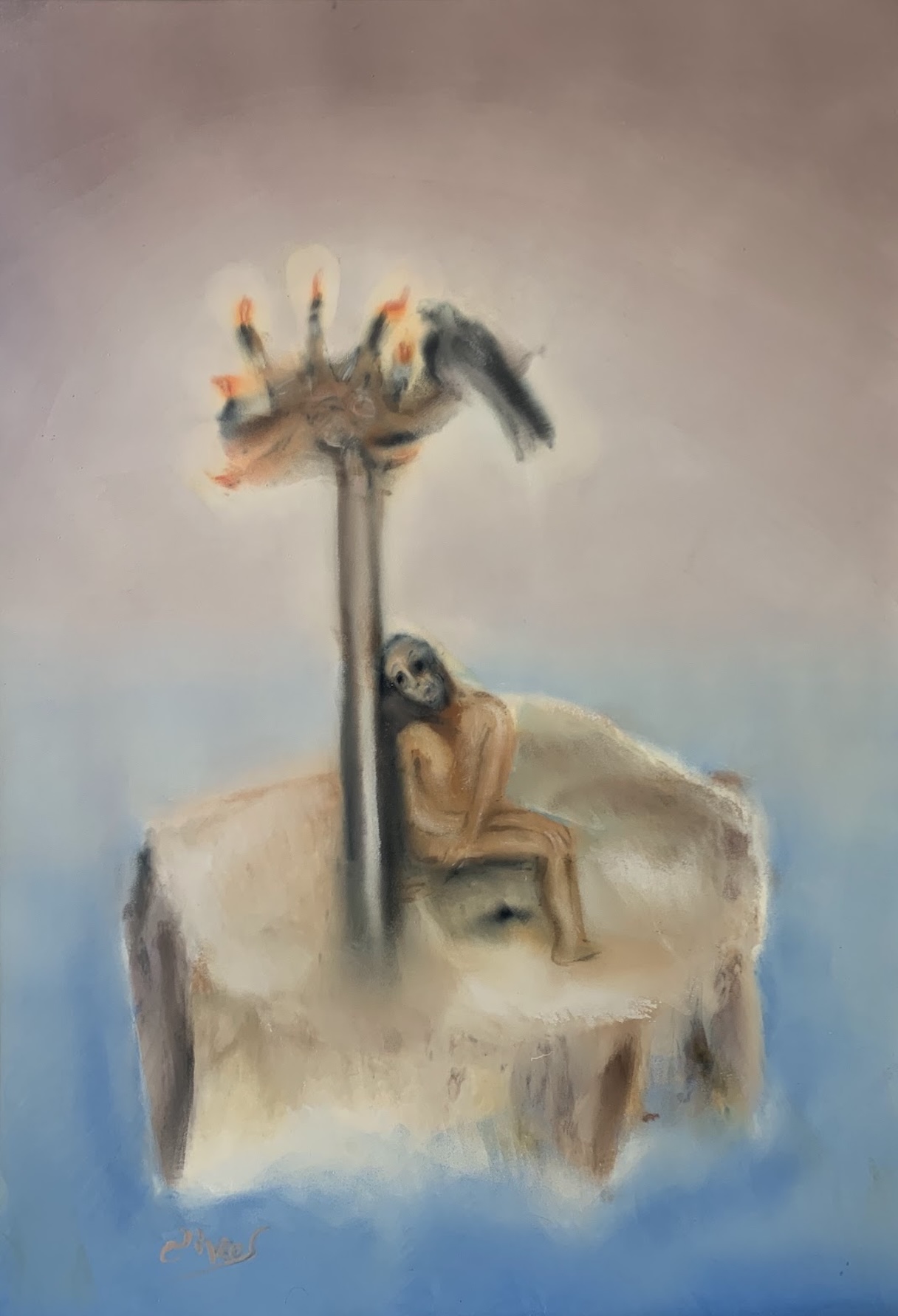 The series of works by Nikos Kypraios entitled Dreams constitutes an introspective and symbolic exploration of the human psyche and its relationship with the environment, inspired by his nocturnal visions. It forms an intermediate pictorial cycle between Erinyes (2019), Odines (2023), and Erebos (2025), in which the artist confronted guilt, moral retribution, psychic trial, and the experience of loss. In Dreams, Kypraios transports us into the very mechanism of dreaming.
