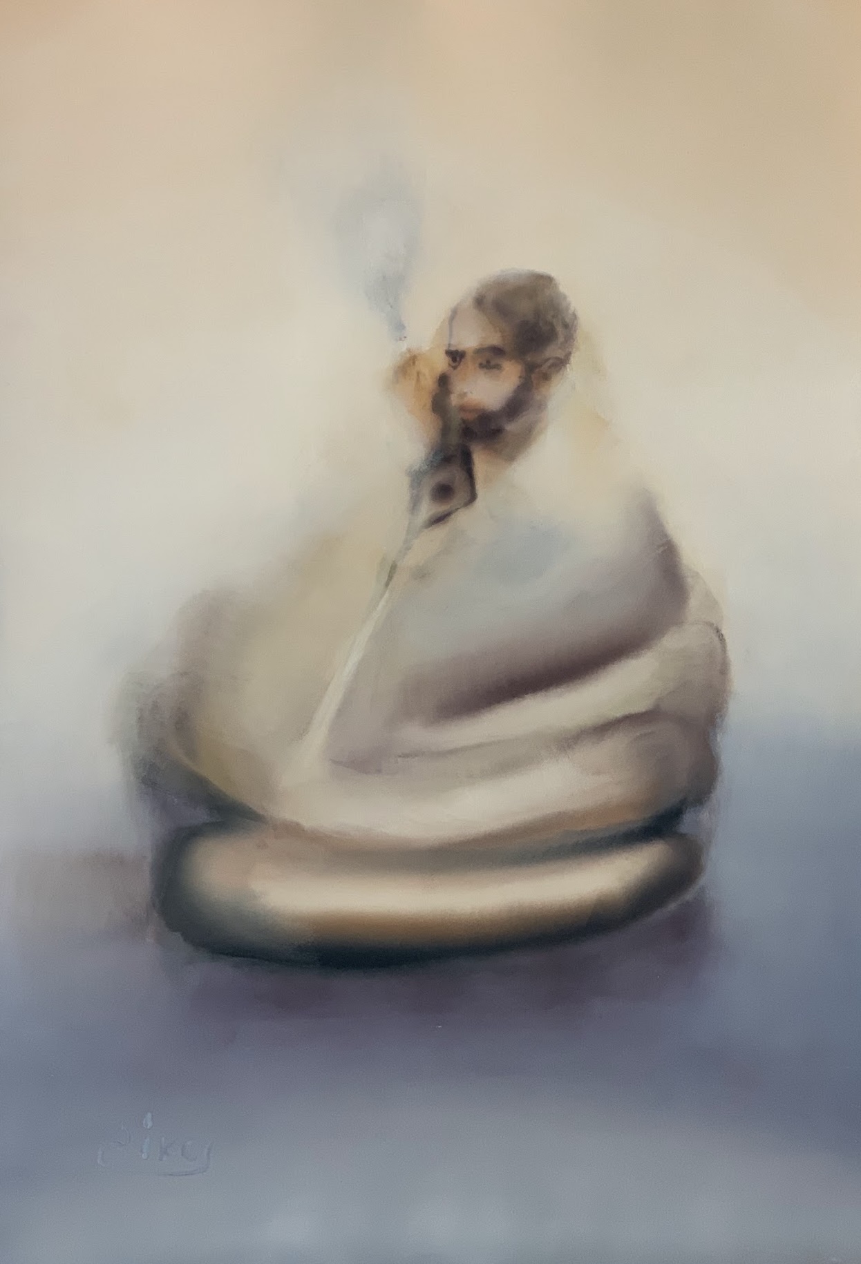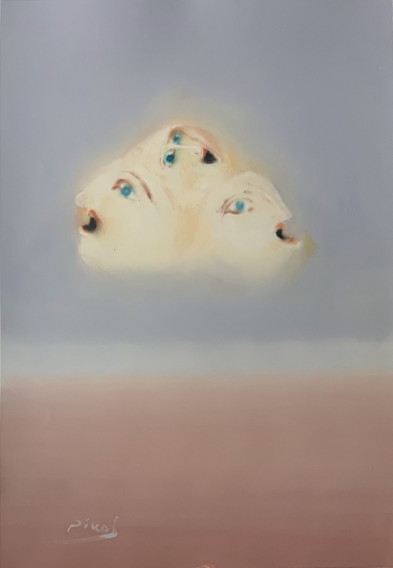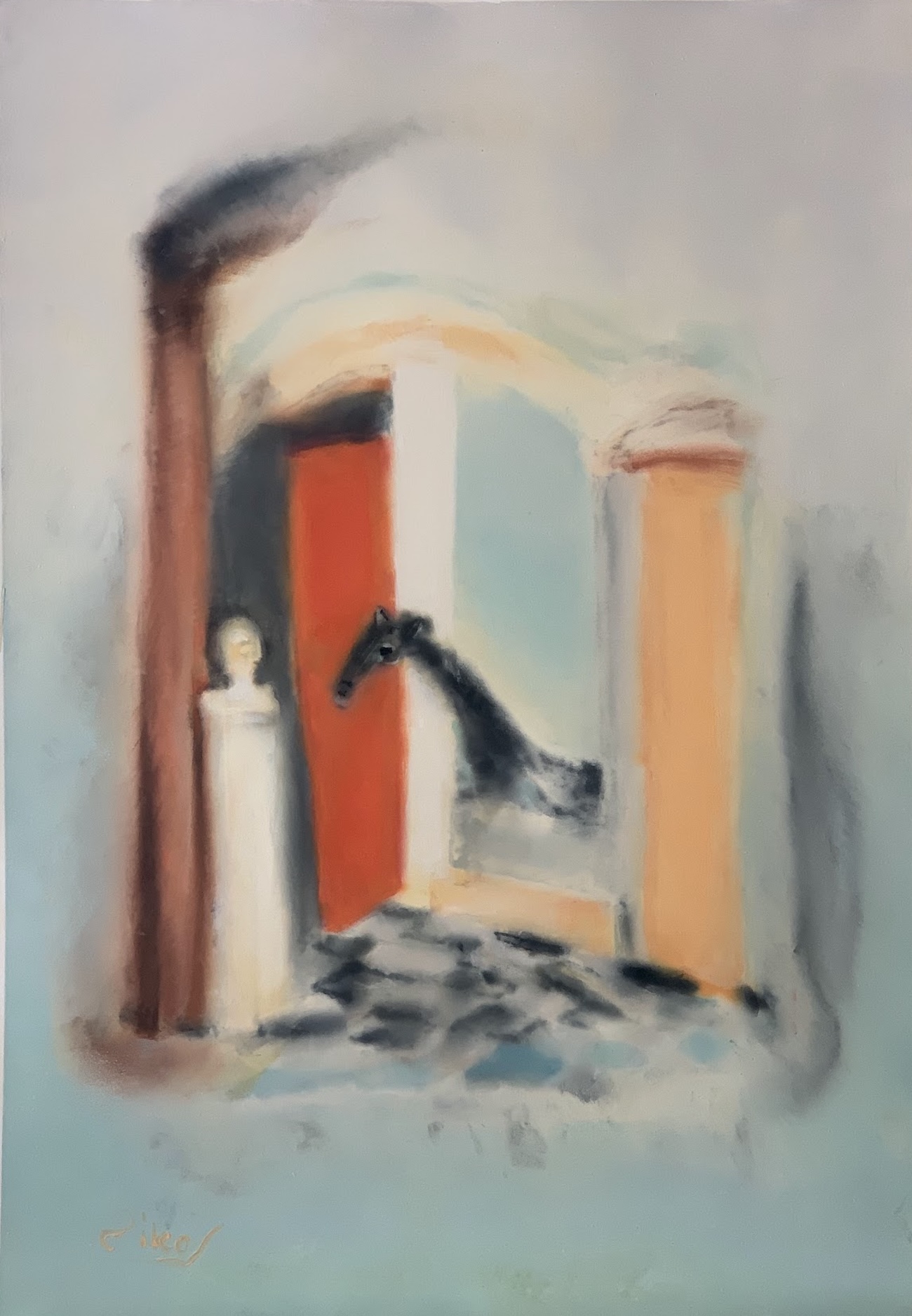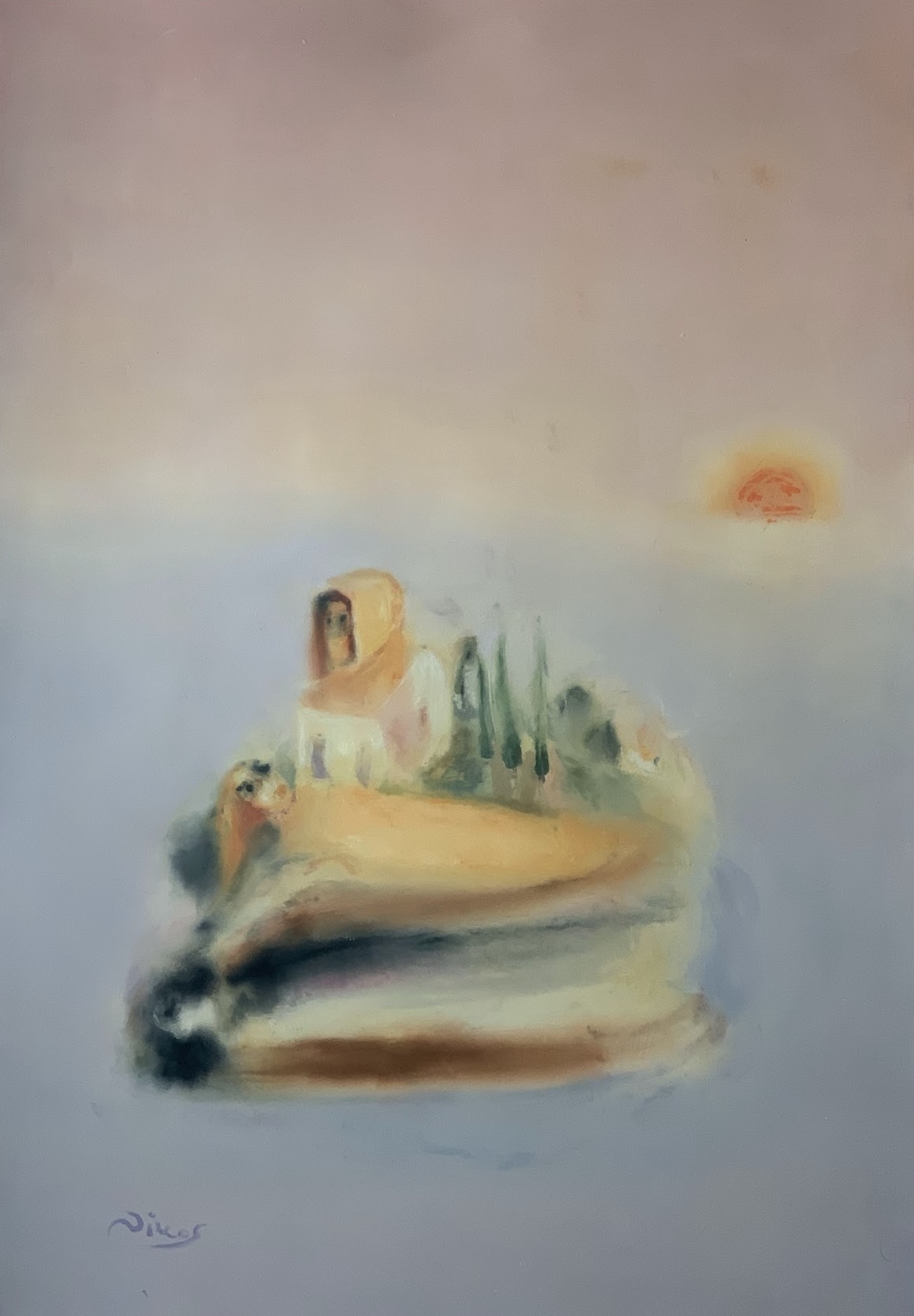 Kypraios’ dreams serve as the generative matrix for some fifty works that unfold as contemplative images of memory and metaphysical anxiety. In subseries that might be called The Dream Machine, Islands of Time, Dream Chronotopia, and The Double Logic of Dreaming, Kypraios weaves together two principles: the mythical and the irrational. The former provides archetypes (mask, altar, procession, threshold), while the latter introduces discontinuities of scale and function, allowing objects to acquire gaze and bodies to become places (torso–settlement, face–island). Mist, as a structural component of the image, together with soft chromatic contrasts and open spatial composition, allows these two logics to coexist in fragile balance. The viewer is invited to recognize the archetype and to accept discontinuity as the essential content of the image.