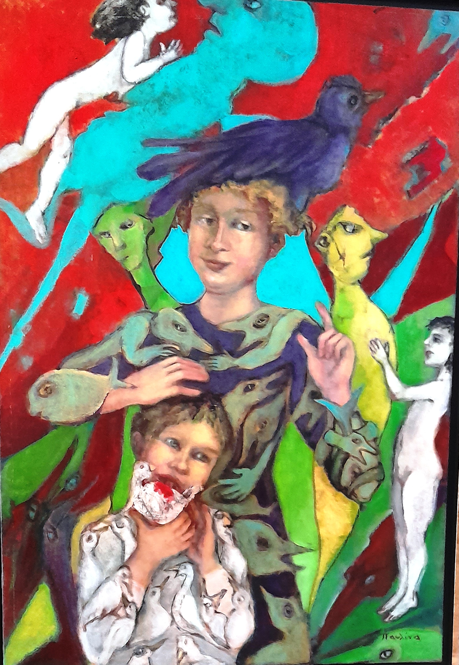Όπως στη ζωγραφική της Leonora Carrington (1917-2011), υβρίδια ζώων και ανθρώπων, γιγαντιαίες θεές, χώροι μαγικής μεταμόρφωσης και αινιγματικά πλάσματα αποκαλύπτουν τις απόκρυφες γωνιές της ψυχής (MoMA) παρόμοια και η Παυλίνα Παμπούδη οραματίζεται τη γυναίκα ως κοσμική αρχή, όχι ως κοινωνικό πρόσωπο. Η μητρική θεότητα δεν υπηρετεί την ηθική της φροντίδας αλλά εικονοποιεί μια δαιμονική, υπερβατική ύπαρξη, πέρα από το καλό και το κακό.