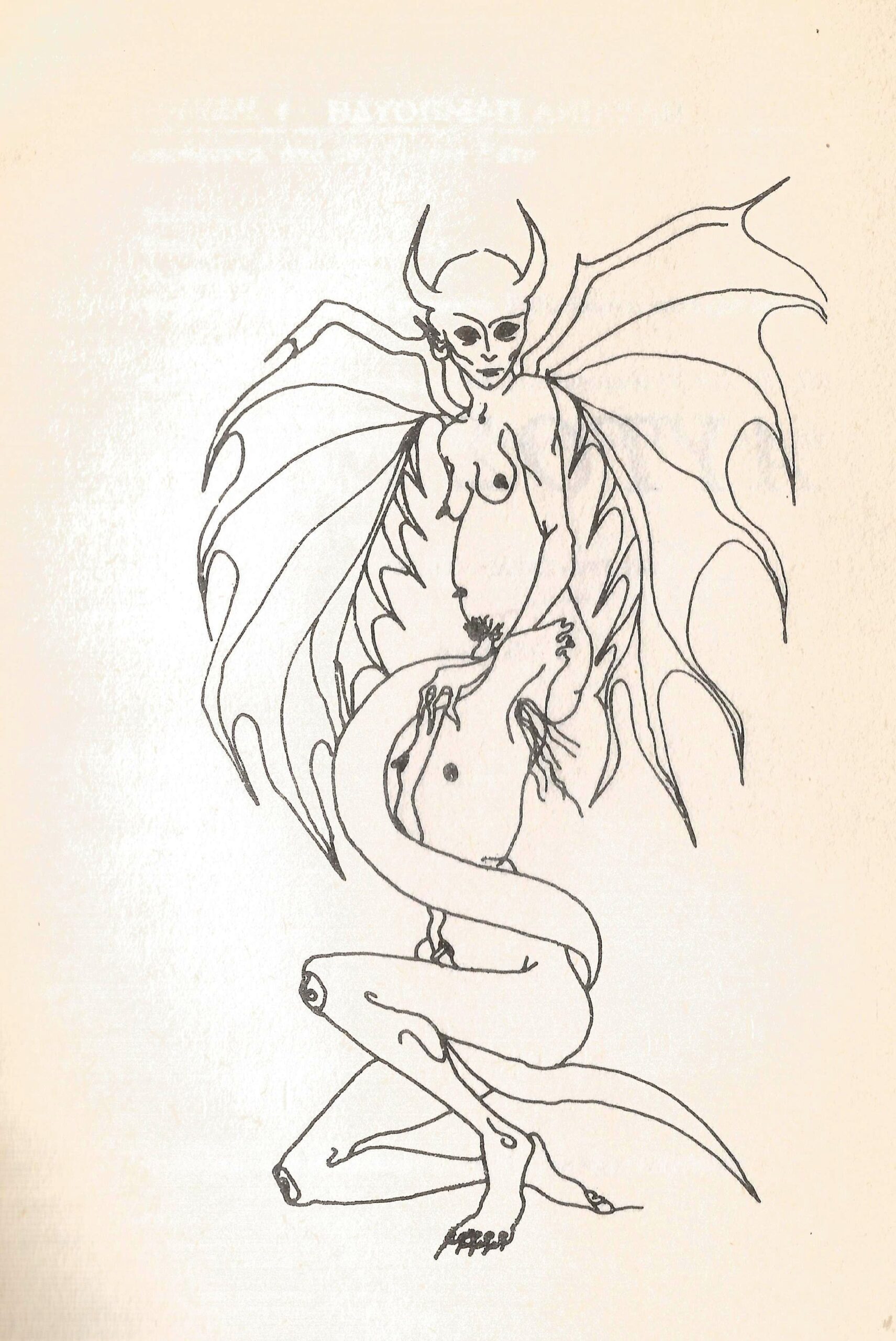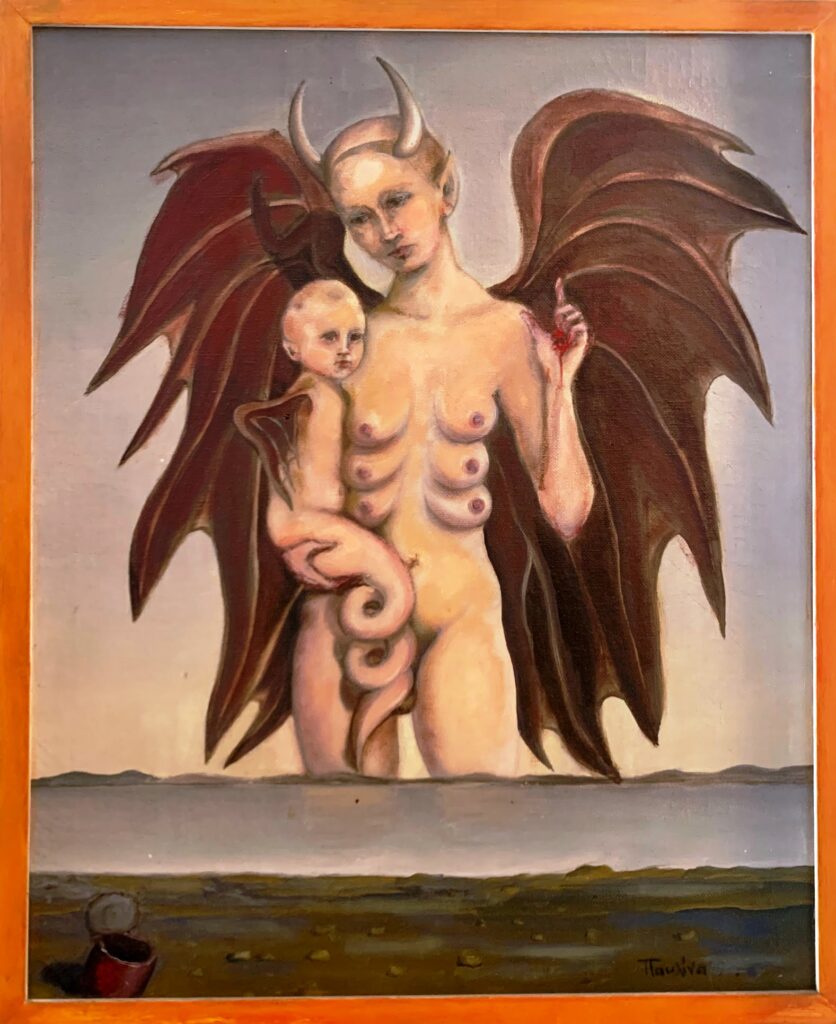 Στο Αυτός Εγώ (1980), η μητέρα μεταμορφώνεται σε μια χαοτική θεότητα: υβριδική, μεταφυσική, με φτερά νυχτερίδας, κέρατα, πολλαπλά στήθη και μ’ ένα βρέφος με ουρά ερπετού αγκαλιά. Η μορφή κυριαρχεί στο τοπίο σαν αρχέγονος δαίμονας, φορέας ενός σκοτεινού αρχέτυπου. Το βλέμμα της χαμηλωμένο, προκαλεί μια υπαρξιακή ανησυχία. Τα πολλαπλά της στήθη θυμίζουν την Άρτεμη της Εφέσου, σύμβολο αφθονίας και προστασίας, όμως η δαιμονική μητέρα της Παμπούδη ανατρέπει τη μητρική ασφάλεια. Δεν προσφέρει φροντίδα. Είναι ταυτόχρονα Λίλιθ, Μήδεια, Κάλι και Μεγάλη Θεά μαζί! Το ανυψωμένο αριστερό της χέρι, αντί να ευλογεί, αιμορραγεί. Εδώ η μητέρα-θεότητα δεν προστατεύει αλλά ενσαρκώνει τη δύναμη του αρχετυπικού τρόμου που δημιουργεί μέσα από τη βία και τη σωματική μνήμη. Όπως η Kiki Smith, στο Virgin Mary (1992. SFMOMA) αποδομεί τη χριστιανική εικονογραφία του σώματος της Παναγίας απογυμνώνοντάς την έως και από τα εσωτερικά της όργανα, ανάλογα και η Παμπούδη αναδομεί την έννοια της μητρότητας, όχι για να την ακυρώσει, αλλά για να την επανεφεύρει σαν οντολογική αγωνία.