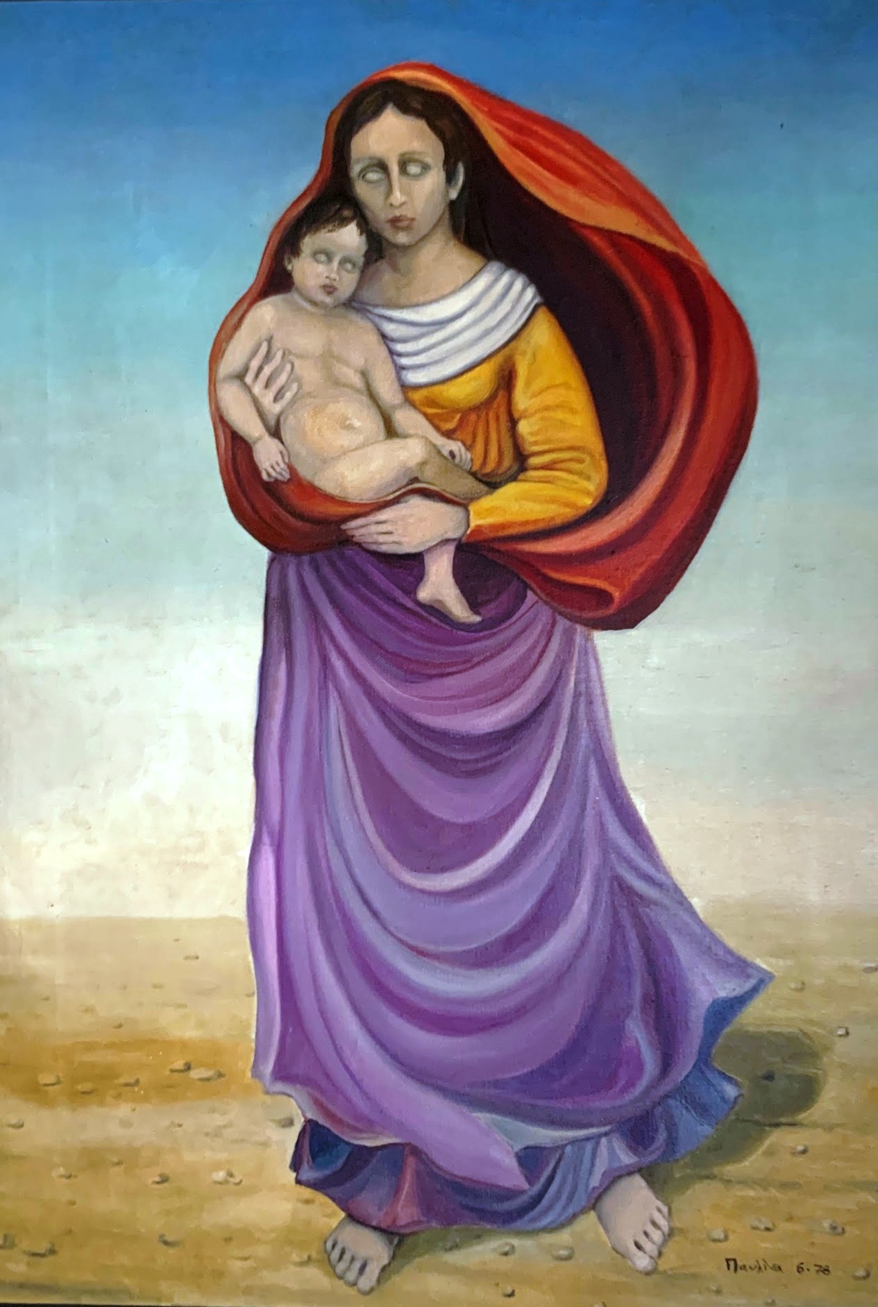 Στη Μαρία στην Έρημο (1978), η μητέρα εμφανίζεται απονευρωμένη, σχεδόν κενή. Στο Αυτός Εγώ (1980), μετατρέπεται σε πεδίο υπερφυσικής εξουσίας και ταυτόχρονα αρχέγονη απειλή. Έτσι η φεμινιστική κριτική της θεσμικής μητρότητας όπως διατυπώθηκε από την Julia Kristeva και τη Luce Irigaray κωδικοποιείται ζωγραφικά από την Παυλίνα Παμπούδη σε από-εξιδανικευμένες μορφές που γίνονται πεδία ψυχικής και πολιτισμικής σύγκρουσης.