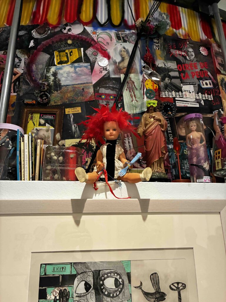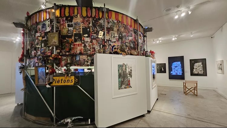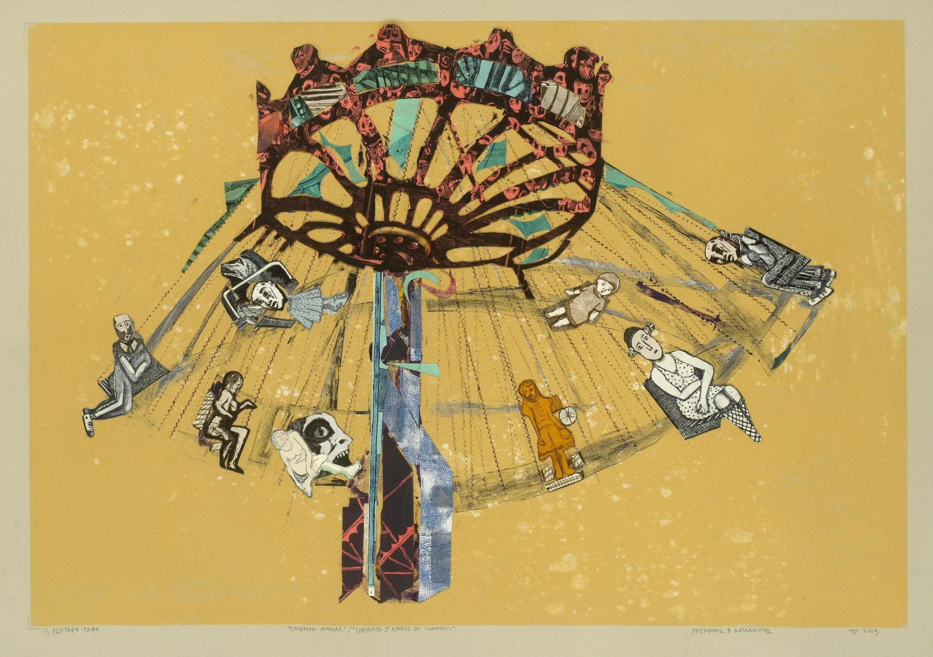 Το καρουζέλ που δεσπόζει στον εκθεσιακό χώρο, θυμίζοντας μικρογραφία τσίρκου ή περιφερόμενο μηχανισμό ψυχαγωγίας, δεν είναι απλώς μια εγκατάσταση, αλλά μια κατασκευή με πολυεπίπεδο συμβολικό και εικαστικό περιεχόμενο. Εξωτερικά, το πάνω τμήμα του, είναι ένα εκρηκτικό κολάζ από φωτογραφίες, παλιά παιχνίδια, αποκόμματα, ανακυκλωμένα υλικά, λαμπάκια, βιβλία, πίνακες και σχέδια, μια μεγάλη ποικιλία της pop και trash κουλτούρας.
