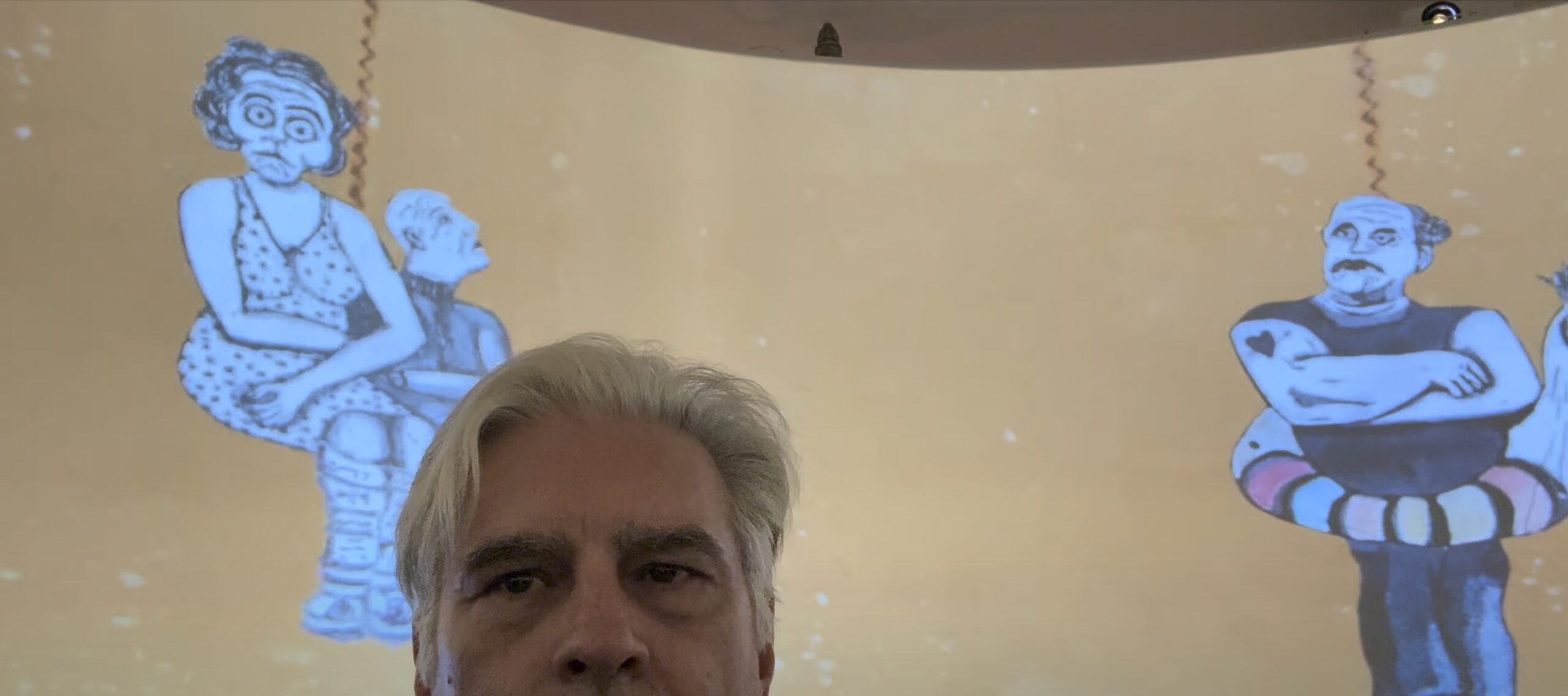 Αν το εξωτερικό του καρουζέλ είναι μια «ζωφόρος της υπερφόρτωσης πληροφοριών», το εσωτερικό του μεταμορφώνεται σε ατμοσφαιρικό θόλο ονειρικής περιστροφής. Προτζέκτορες προβάλλουν κινούμενες μορφές σε κυκλική διάταξη, μετατρέποντας τον εσωτερικό χώρο σε οπτικό μηχανισμό μνήμης και φαντασίας. Οι επίπεδες γκροτέσκες μορφές, οι οποίες προέρχονται από την χαρακτική του, αποκτούν ψηφιακή ζωντάνια καθώς αιωρούνται ρυθμικά και επαναλαμβάνονται, σαν «καρτούν σε μετεωρισμό».
