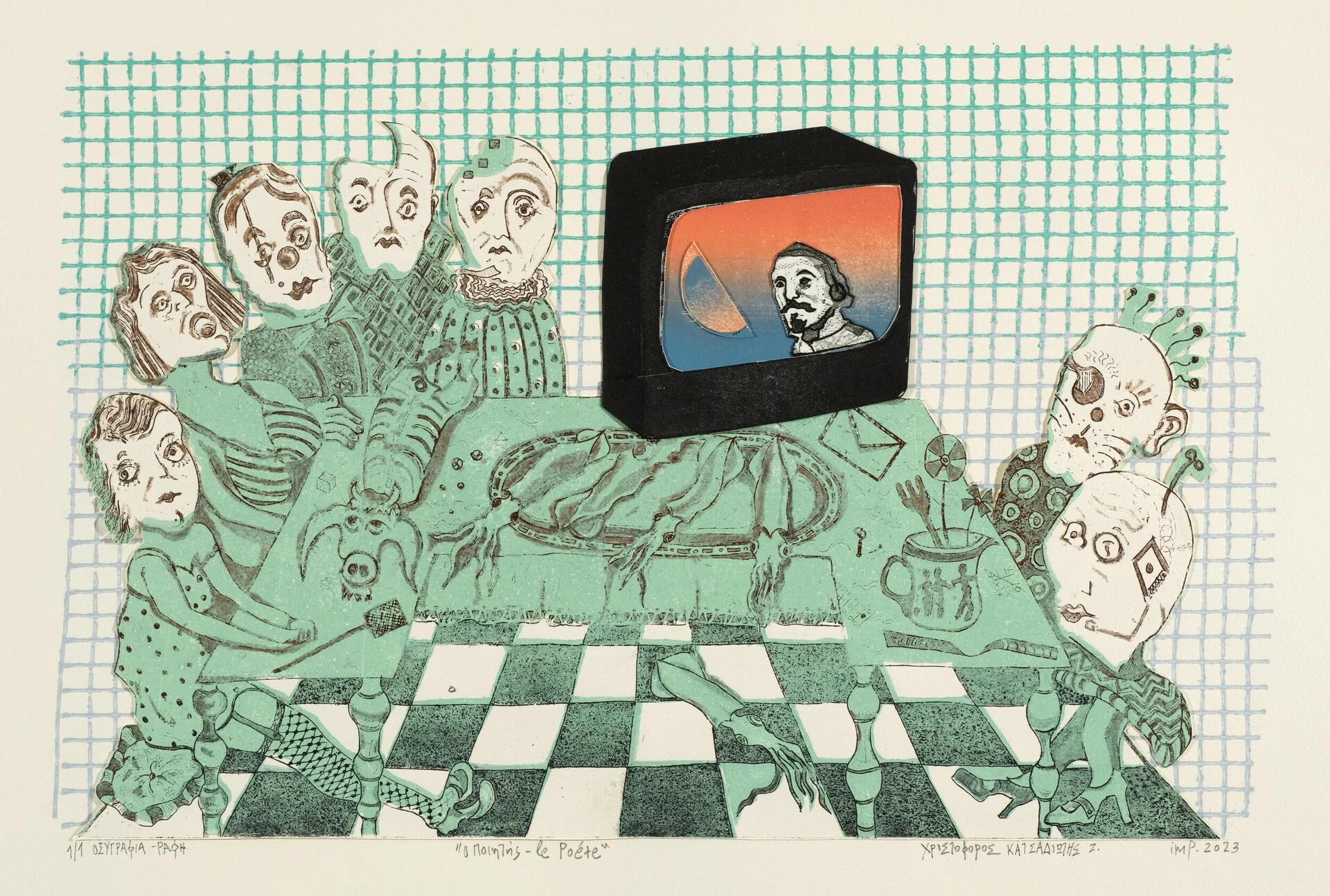 Μια άλλη ιδιαιτερότητα της έκθεσης εντοπίζεται στα χαρακτικά που εκτίθενται στους τοίχους, έξω από το καρουζέλ. Σε έργα όπως «Ο Ποιητής», «Σύνδρομο άπνοιας» και «Ηλιοβασιλέματα στους υπονόμους», το ράψιμο με κλωστή γίνεται ένας οπτικός και εννοιολογικός μηχανισμός του έργου. Η ραφή με κλωστή ενσωματωμένη στο εκτυπωμένο χαρτί ή στην επιφάνεια χαρακτικής δεν παραπέμπει μόνον στην επισκευή, αλλά στην έκθεση του τραύματος, στην χειρονομία που δεν κρύβεται, αλλά δηλώνεται.