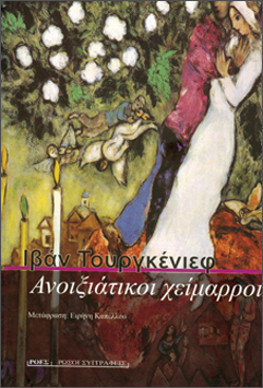 Οι Αvοιξιάτικοι χείµαρροι γράφτηκαν τριάντα χρόνια µετά από τα γεγονότα που εξιστορούνται στις σελίδες τους. Ο Τουργκένιεφ, σε τούτο το εξαιρετικό και εν µέρει αυτοβιογραφικό έργο, πραγµατεύεται ένα από τα αγαπηµένα θέµατά του: την αδυναµία του ανθρώπου να γνωρίσει την αγάπη χωρίς να χάσει την αθωότητά του