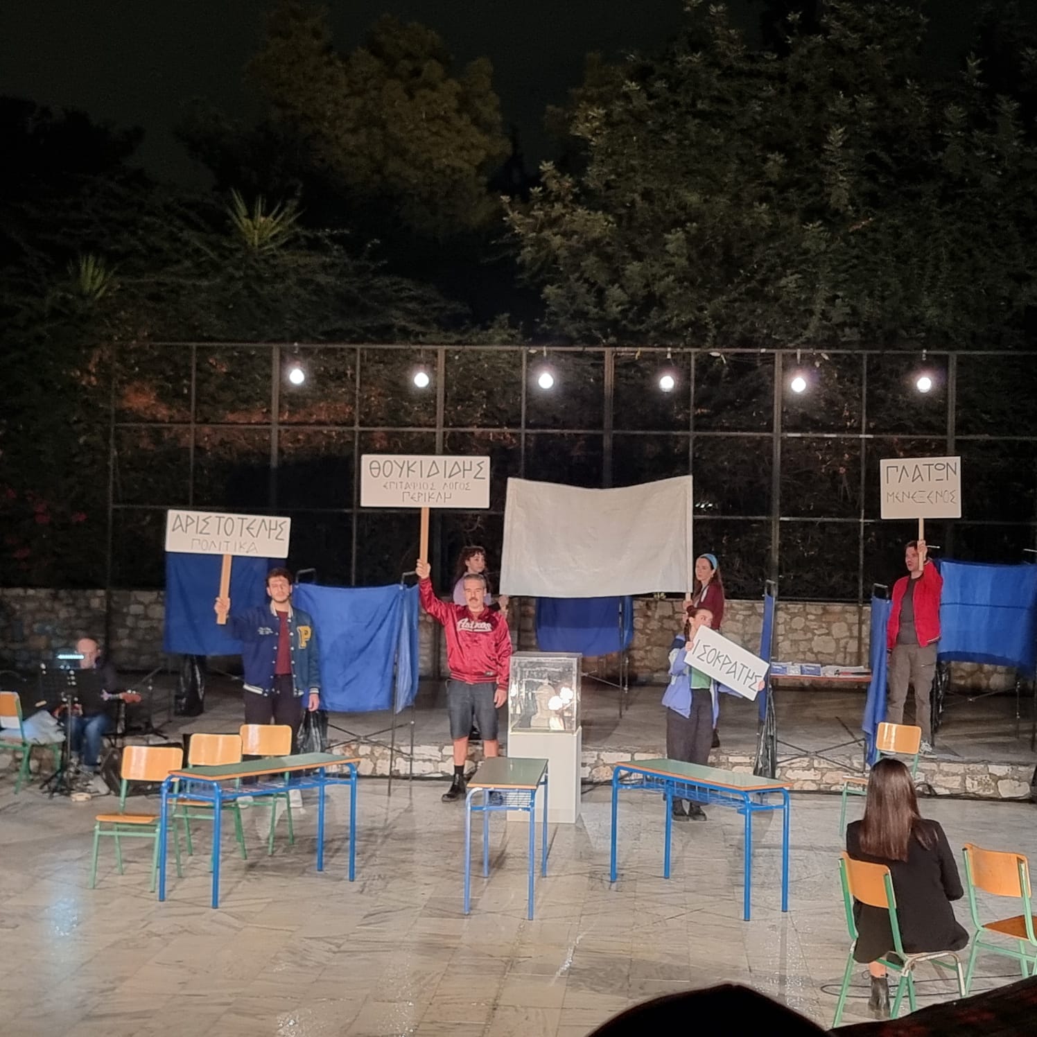 Μια πρωτότυπη παράσταση-σκηνική σύνθεση με θέμα το όραμα της δημοκρατίας σε σχέση με την σκληρή πραγματικότητα της εποχής μας, ειδικά σχεδιασμένη για να κάνει πρεμιέρα στο Φεστιβάλ Κολωνού του Δήμου Αθηναίων.