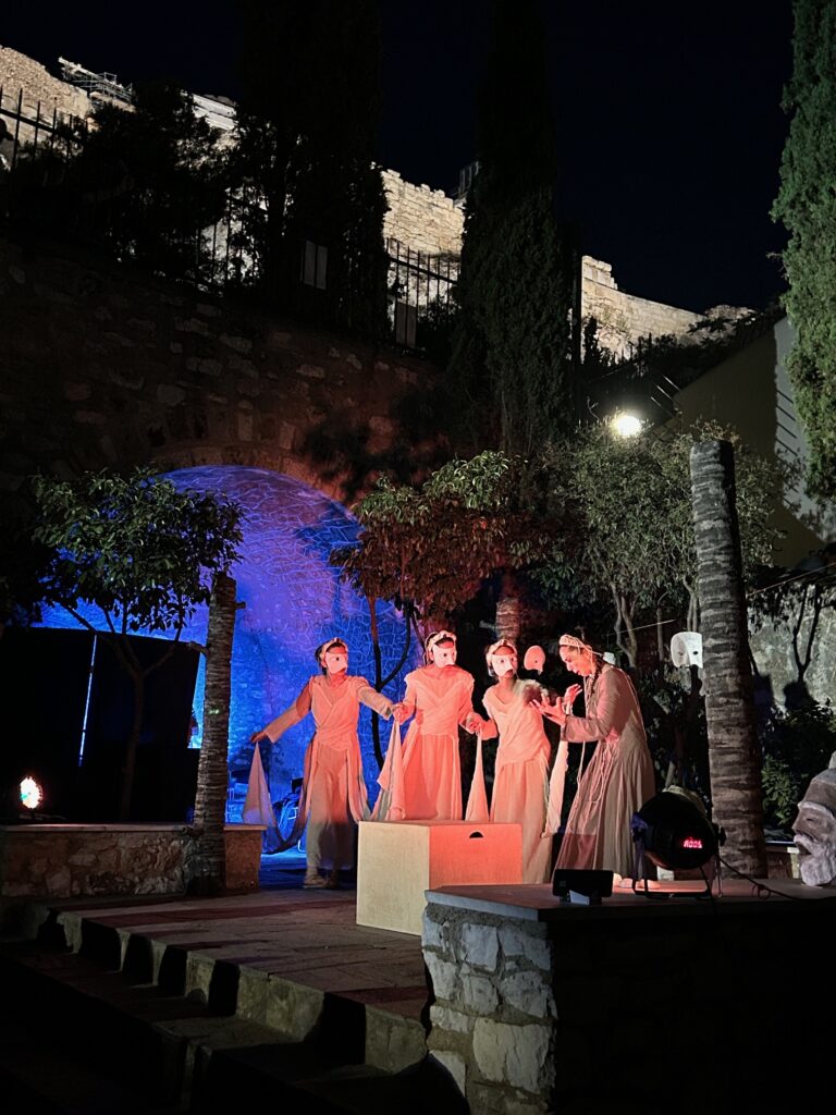 Ορθώς λοιπόν ο Πάνος Αγγελόπουλος, συνεπικουρούμενος από την χαρισματική διεθνή χορογράφο Έρση Πίττα στην διδασκαλία τής κίνησης, από τον Γιάννη Ζημιανίτη στις μάσκες και από την εκπληκτική Διδάκτορα Μάγκυ Μοντζολή Μάγκυ Μοντζολή στα σκηνικά-κοστούμια, έστησε στην ατμοσφαιρική υπαίθρια σκηνή, στον κήπο του Μουσείου Ιστορίας του Πανεπιστημίου Αθηνών, κάτω από τον ιερό βράχο τής πάμφωτης Ακρόπολης ένα συγκινητικό θέαμα-ακρόαμα ξενάγησης στο αρχαίο δράμα.