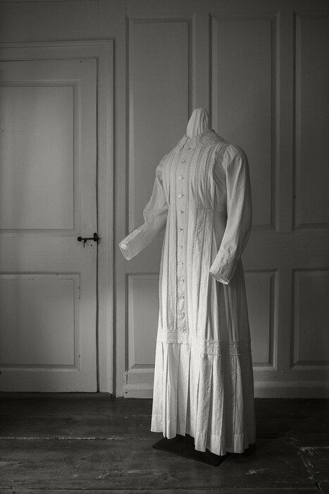 Συνήθιζε να φορά ένα άσπρο φόρεμα πολύ απλό: βαμβακερό πικέ ύφασμα, χαλαρή γραμμή χωρίς έντονη μέση, με πλισέ τελείωμα, δώδεκα μαργαριταρένια κουμπιά, επίπεδο γιακά και μια τσέπη στον δεξιό μηρό. Το κολάρο, τα μανίκια, οι πιέτες και η τσέπη είναι στολισμένα με δαντέλα.
