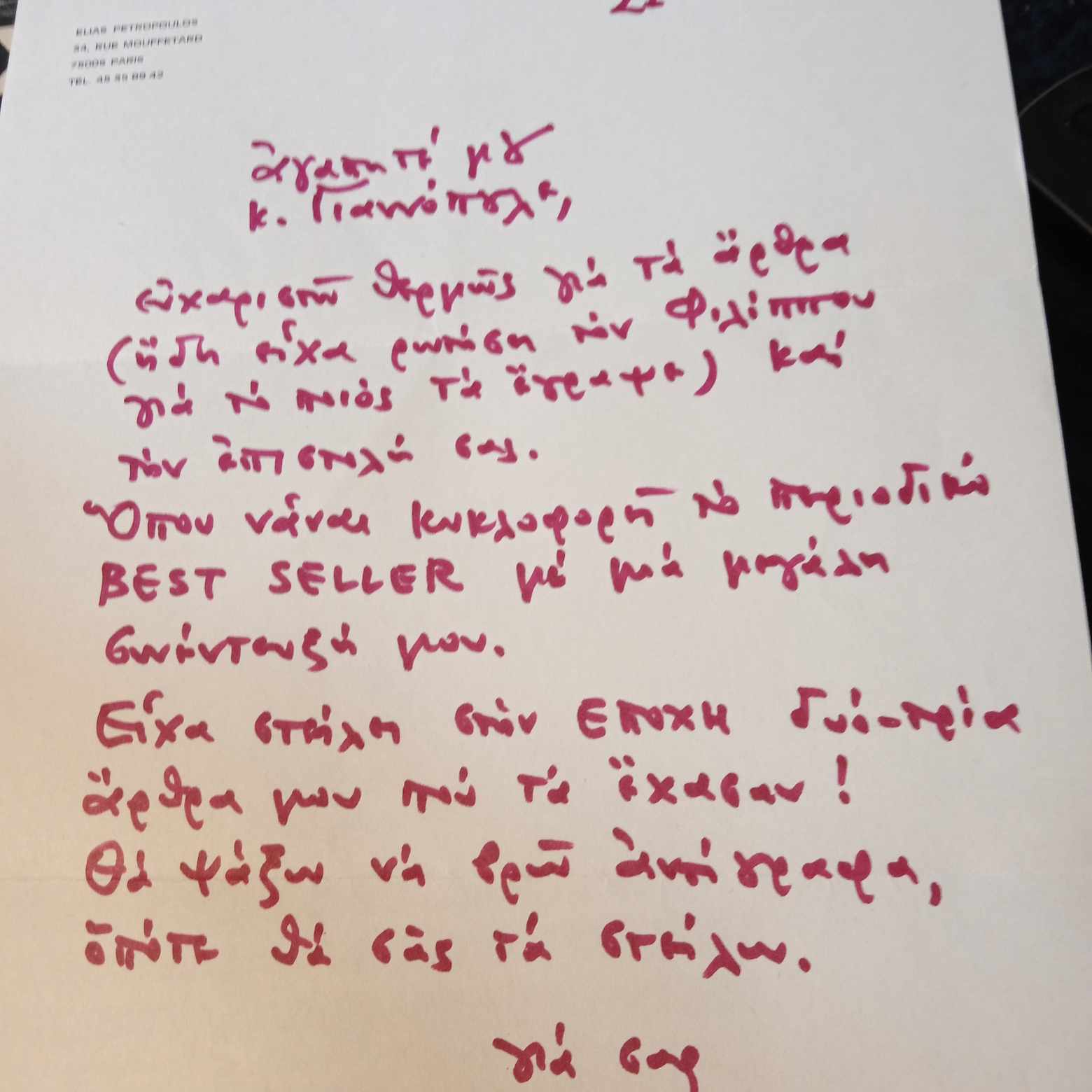 Η επιστολή σε Α4 με μωβ μαρκαδόρο είναι του Ηλία Πετρόπουλου και αποτελεί την έναρξη της συνεργασίας μας.
